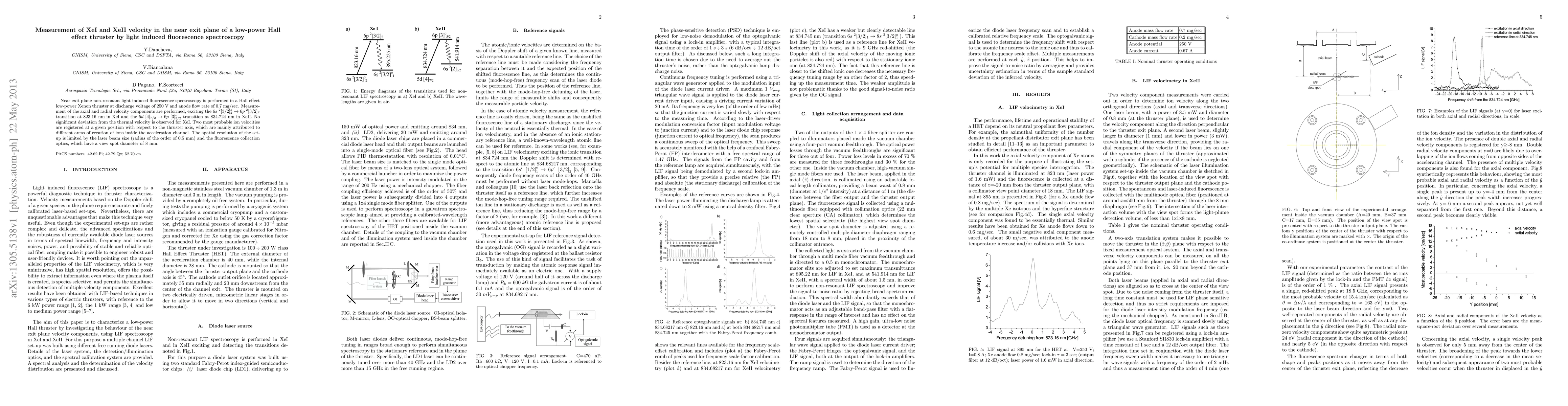 Near exit plane non-resonant light induced fluorescence spectroscopy is performed in a Hall effect low-power Xenon thruster at discharge voltage of 250V and anode flow rate of 0.7mg/sec. Measurement of the axial and radial velocity components are performed, exciting the 6s[3/2]_2-->6p[3/2]_2 transition at 823.16nm in XeI and the 5d[4]_(7/2)-->6p[3]_(5/2) transition at 834.724nm in XeII. No significant deviation from the thermal velocity is observed for XeI. Two most probable ion velocities are registered at a given position with respect to the thruster axis, which are mainly attributed to different areas of creation of ions inside the acceleration channel. The spatial resolution of the set-up is limited by the laser beam size (radius of the order of 0.5mm) and the fluorescence collection optics, which have a view spot diameter of 8mm.
