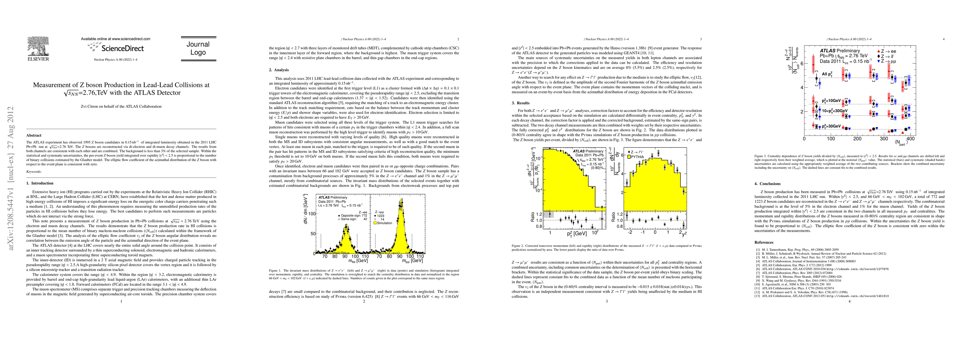 The ATLAS experiment detected 1995 Z bosons in Pb+Pb collisions at 2.76 TeV, with a background rate of less than 3%. The results support the idea that Z boson production is proportional to binary collisions.