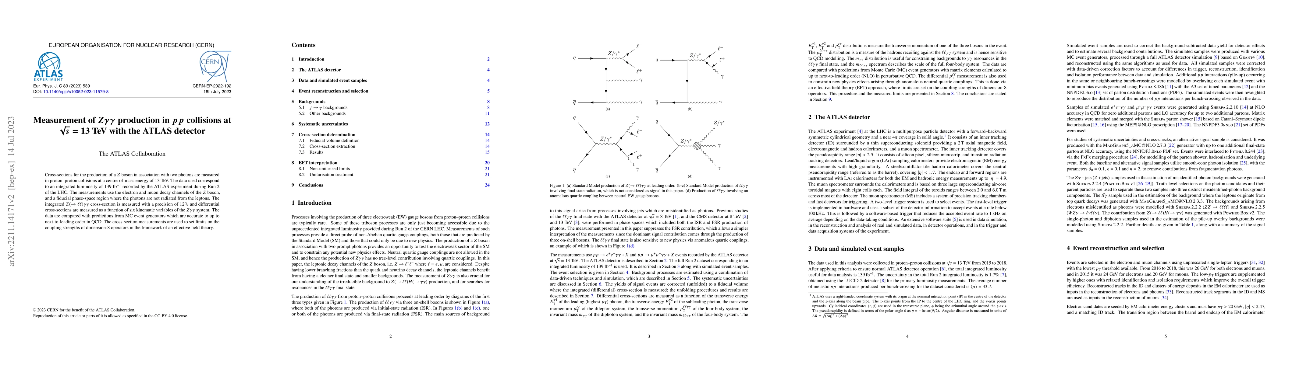 This paper measures the cross-section for $Z$ boson production with two photons in proton-proton collisions at 13 TeV using the ATLAS detector, achieving a precision of 12%. The study also sets limits on the coupling strengths of dimension-8 operators in an effective field theory framework.