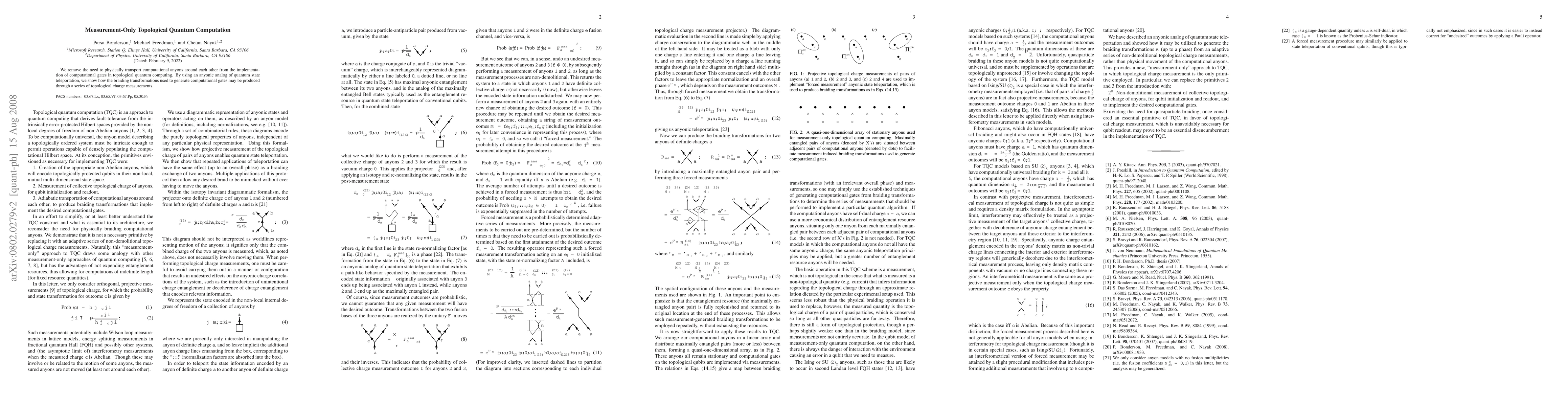 We remove the need to physically transport computational anyons around each other from the implementation of computational gates in topological quantum computing. By using an anyonic analog of quantum state teleportation, we show how the braiding transformations used to generate computational gates may be produced through a series of topological charge measurements.