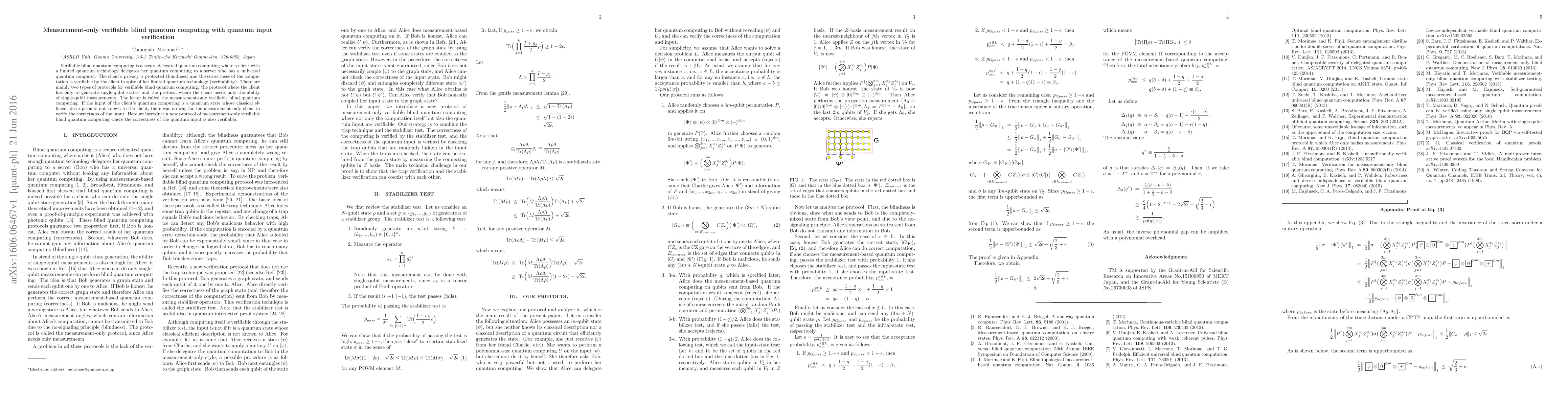 This paper proposes a novel protocol for measurement-only verifiable blind quantum computing that allows clients with limited quantum capabilities to verify the correctness of their quantum input states, enhancing both the security and verifiability of delegated quantum computations.