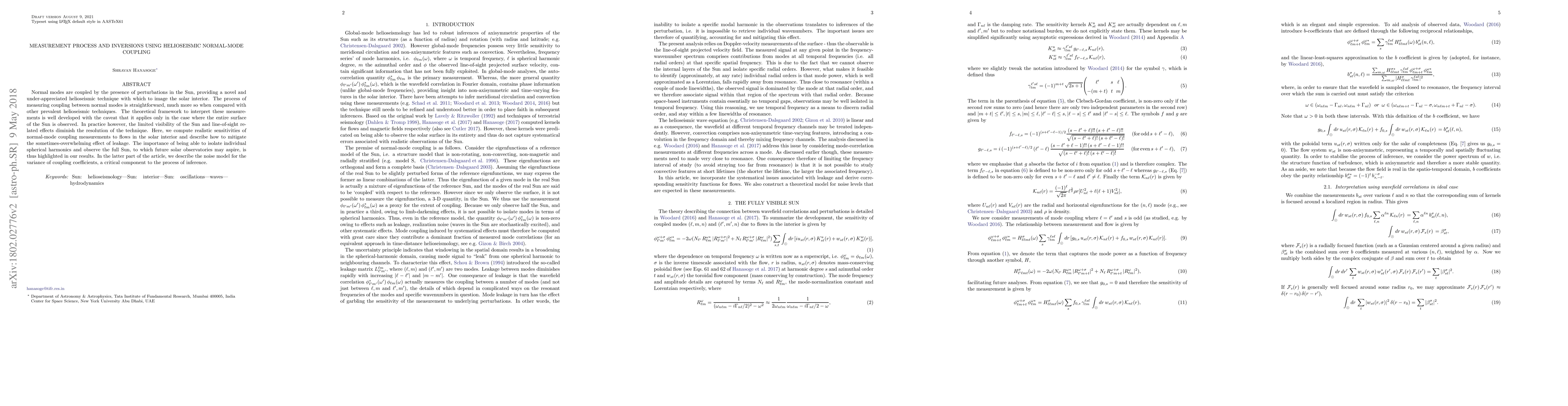 This paper explores a novel helioseismic technique for imaging the solar interior by measuring coupling between normal modes, which is more straightforward than other methods. It highlights the importance of observing the full Sun and mitigating leakage effects to improve resolution and inference accuracy.