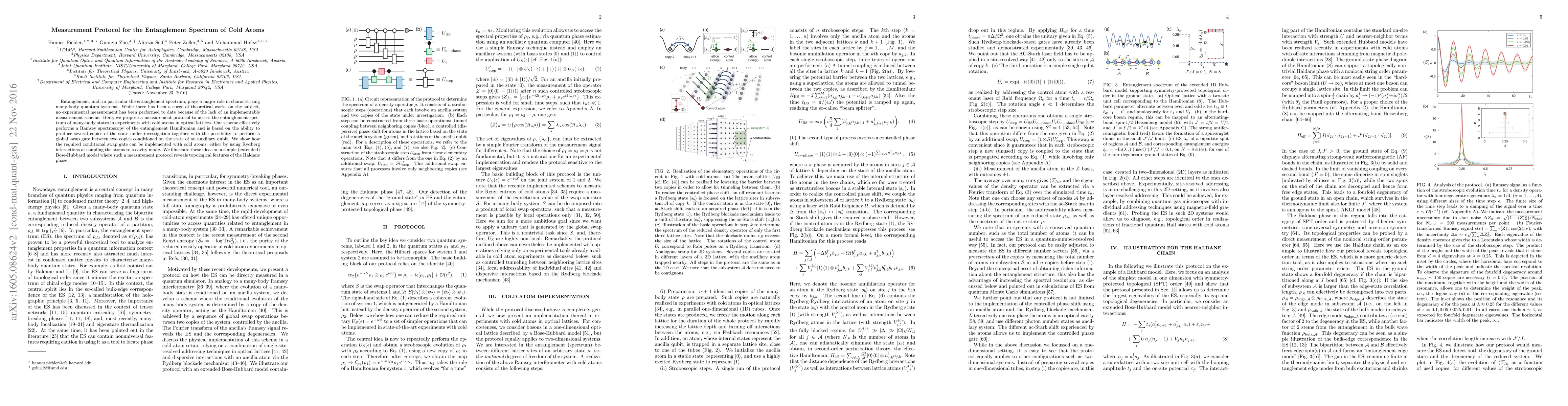 This paper proposes a novel measurement protocol to access the entanglement spectrum of many-body states in cold atom experiments using optical lattices. The protocol employs Ramsey spectroscopy of the entanglement Hamiltonian and conditional swap gates, which can be implemented via Rydberg interactions or cavity-atom coupling, to reveal topological features in the Haldane phase.