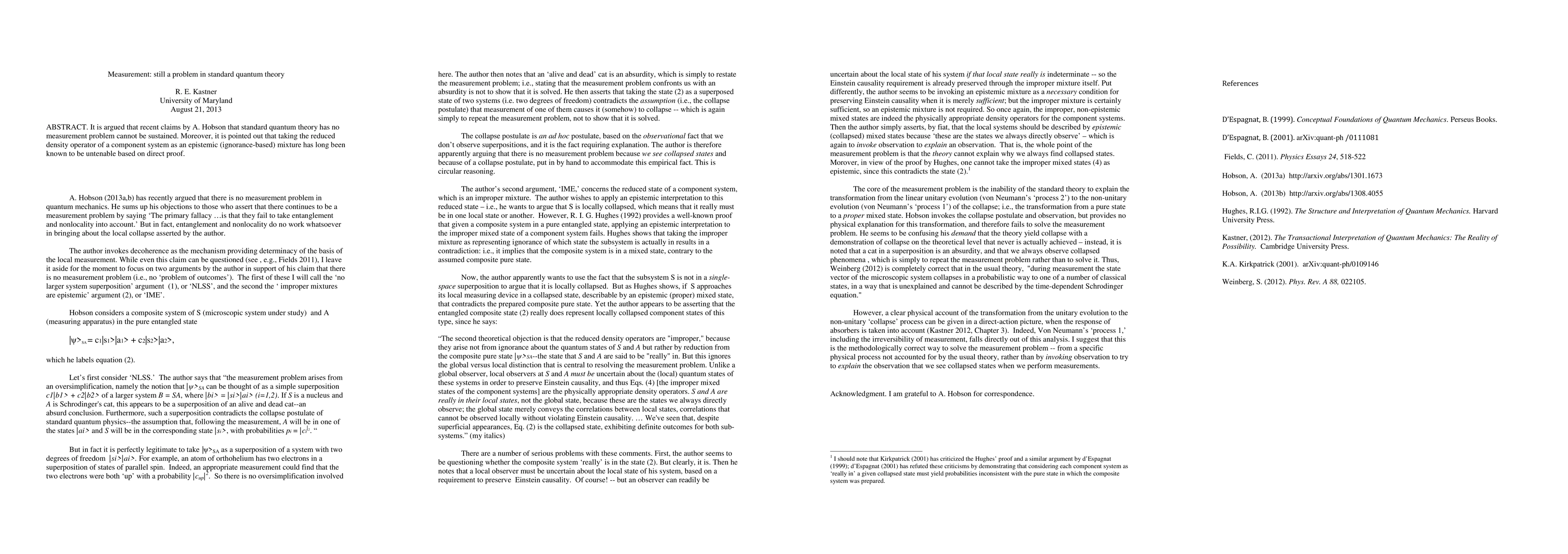 It is argued that recent claims by A. Hobson that standard quantum theory has no measurement problem cannot be sustained. Moreover, it is pointed out that taking the reduced density operator of a component system as an epistemic (ignorance-based) mixture has long been known to be untenable based on direct proof.