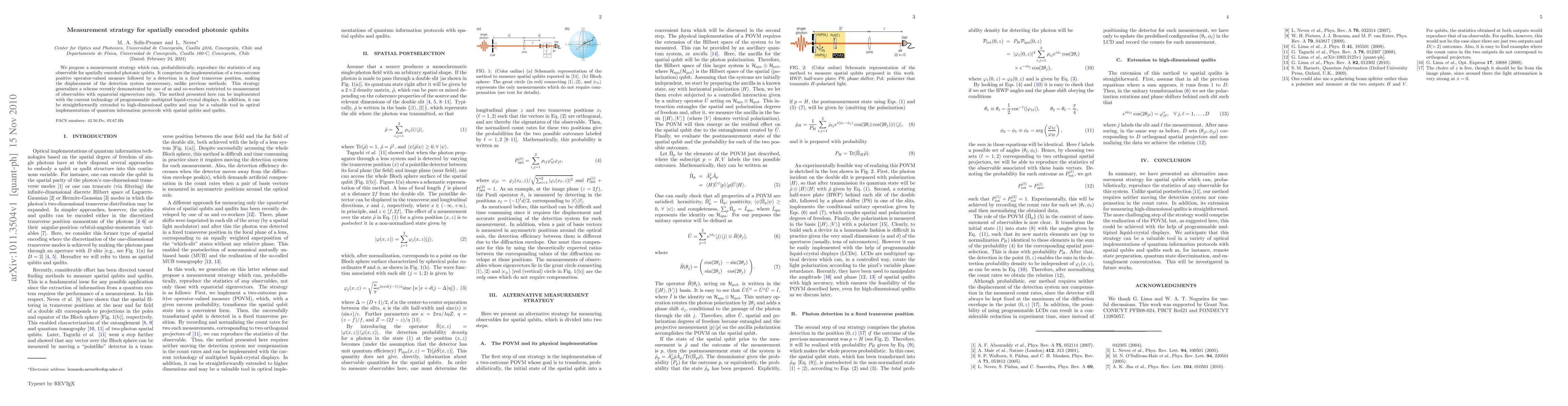 This paper proposes a novel measurement strategy for spatially encoded photonic qubits that probabilistically reproduces observable statistics using a two-outcome positive operator-valued measure and fixed transverse detection. Unlike previous methods, it eliminates the need for displacement of the detection system, and can be implemented with current technology.
