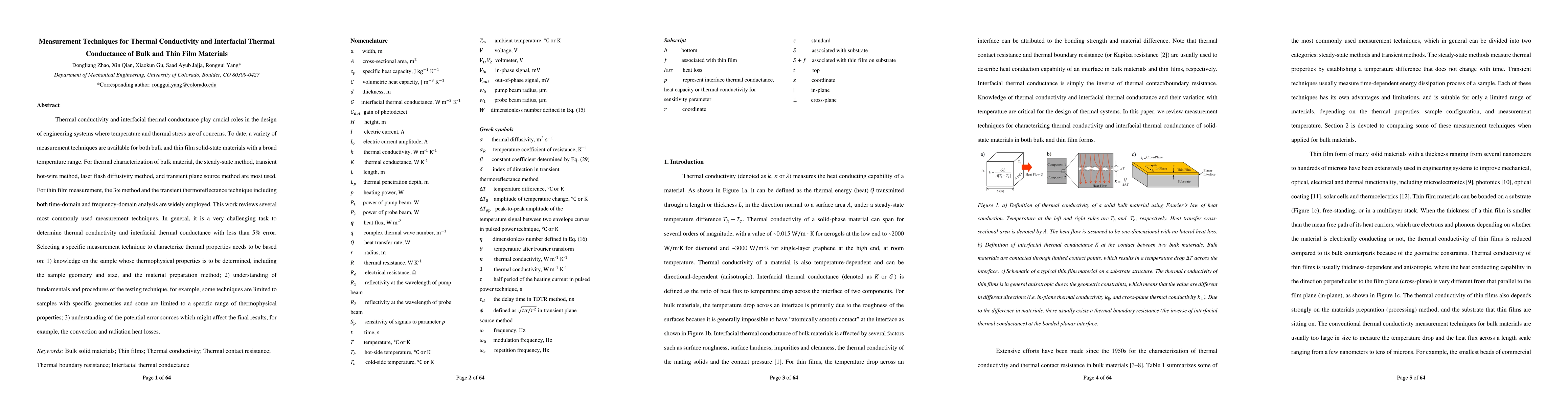 This paper reviews various measurement techniques for thermal conductivity and interfacial thermal conductance in bulk and thin film materials, emphasizing the importance of selecting appropriate methods based on sample characteristics, technique fundamentals, and potential error sources. Key techniques include steady-state methods, laser flash, transient plane source, 3ω method, and thermoreflectance for different material types.