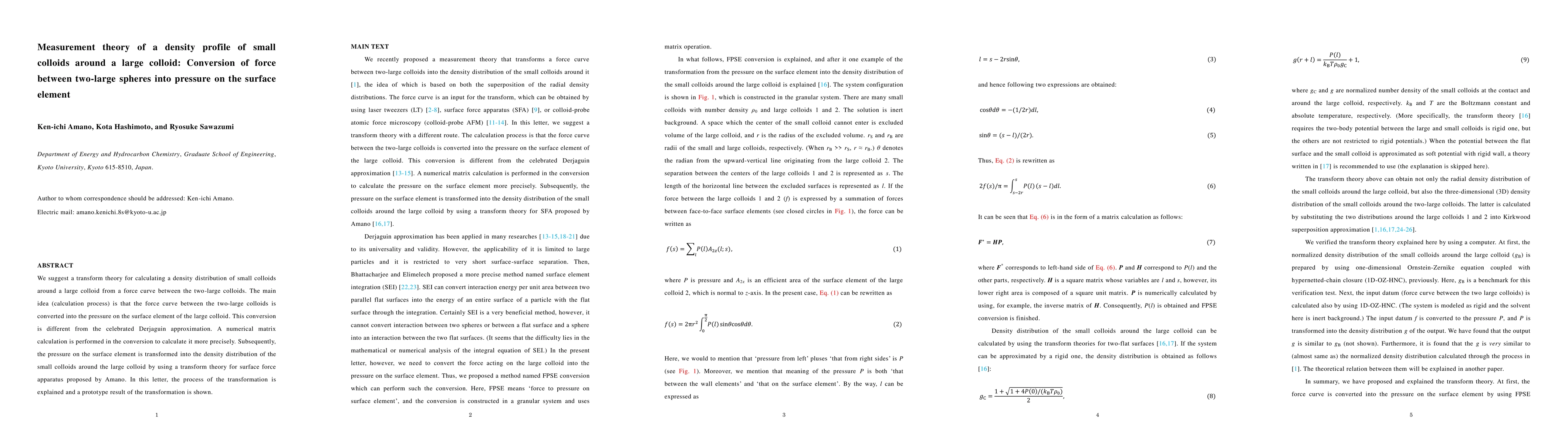 This paper proposes a novel transform theory to calculate the density distribution of small colloids around a large colloid by converting the force curve between two large spheres into pressure on the surface element, differing from the Derjaguin approximation. A numerical matrix calculation enhances precision, followed by a transformation to determine the density distribution using Amano's surface force apparatus theory.