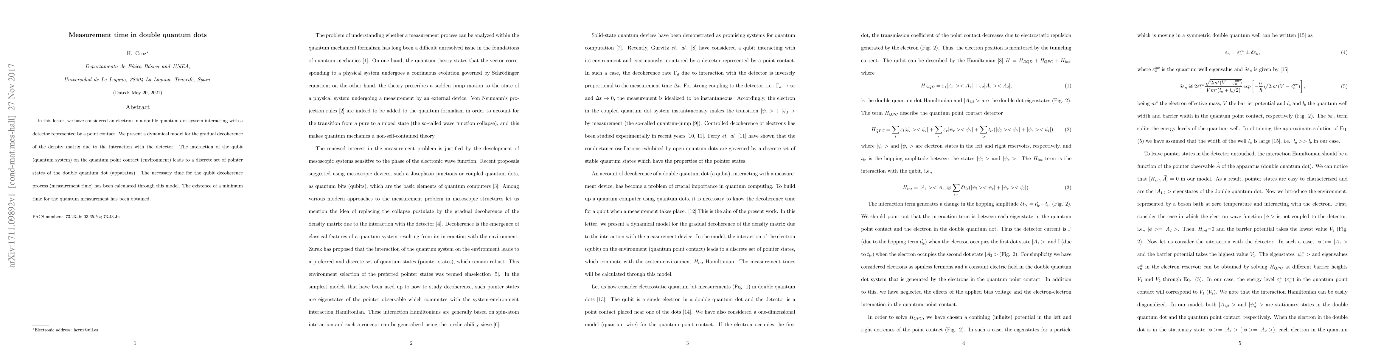 A model predicts a minimum time for quantum measurement in double quantum dots, where interaction with a detector causes decoherence, leading to the loss of quantum coherence.