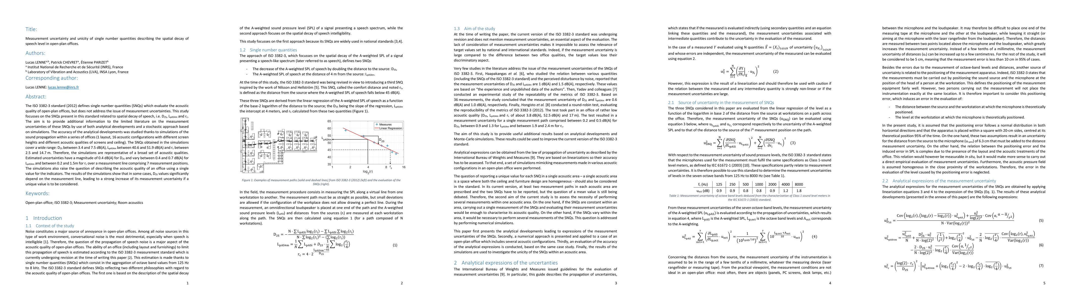 The ISO 3382-3 standard (2012) defines single number quantities (SNQs) which evaluate the acoustic quality of open-plan offices, but does not address the issue of measurement uncertainties. This study focusses on the SNQs present in this standard related to spatial decay of speech, i.e. D 2S , L pAS4m and r c. The aim is to provide additional information to the limited literature on the measurement uncertainties of these SNQs by use of both analytical developments and a stochastic approach based on simulations. The accuracy of the analytical developments was studied thanks to simulations of the sound propagation within a series of offices (1 layout, 16 acoustic configurations with different screen heights and different acoustic qualities of screens and ceiling). The SNQs obtained in the simulations cover a wide range: D 2S between 3.4 and 7.5 dB(A), L pAS4m between 40.6 and 51.9 dB(A) and r c between 2.5 and 14.7 m. Therefore, the simulations are representative of a broad set of acoustic qualities. Estimated uncertainties have a magnitude of 0.4 dB(A) for D 2S and vary between 0.4 and 0.7 dB(A) for L pAS4m and between 0.2 and 1.5 m for r c over a measurement path comprising 7 measurement positions. The simulations also raise the question of describing the acoustic quality of an office using a single value for the indicators. The results of the simulations show that in some cases, D 2S values significantly depend on the measurement path, leading to a strong increase of its measurement uncertainty if a unique value is to be considered.