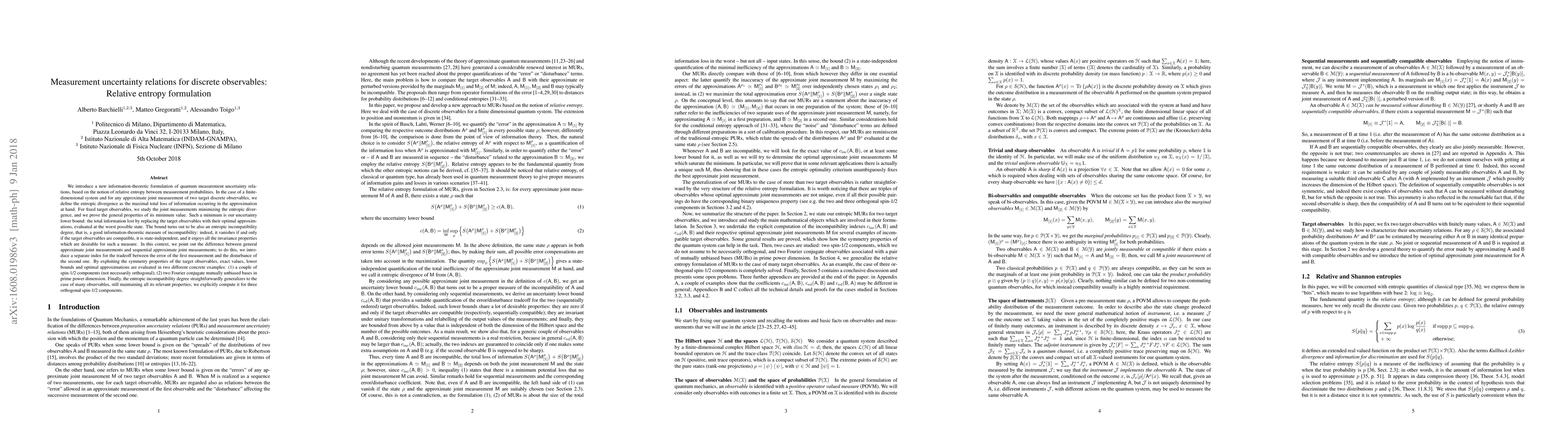 We introduce a new information-theoretic formulation of quantum measurement uncertainty relations, based on the notion of relative entropy between measurement probabilities. In the case of a finite-dimensional system and for any approximate joint measurement of two target discrete observables, we define the entropic divergence as the maximal total loss of information occurring in the approximation at hand. For fixed target observables, we study the joint measurements minimizing the entropic divergence, and we prove the general properties of its minimum value. Such a minimum is our uncertainty lower bound: the total information lost by replacing the target observables with their optimal approximations, evaluated at the worst possible state. The bound turns out to be also an entropic incompatibility degree, that is, a good information-theoretic measure of incompatibility: indeed, it vanishes if and only if the target observables are compatible, it is state-independent, and it enjoys all the invariance properties which are desirable for such a measure. In this context, we point out the difference between general approximate joint measurements and sequential approximate joint measurements; to do this, we introduce a separate index for the tradeoff between the error of the first measurement and the disturbance of the second one. By exploiting the symmetry properties of the target observables, exact values, lower bounds and optimal approximations are evaluated in two different concrete examples: (1) a couple of spin-1/2 components (not necessarily orthogonal); (2) two Fourier conjugate mutually unbiased bases in prime power dimension. Finally, the entropic incompatibility degree straightforwardly generalizes to the case of many observables, still maintaining all its relevant properties; we explicitly compute it for three orthogonal spin-1/2 components.