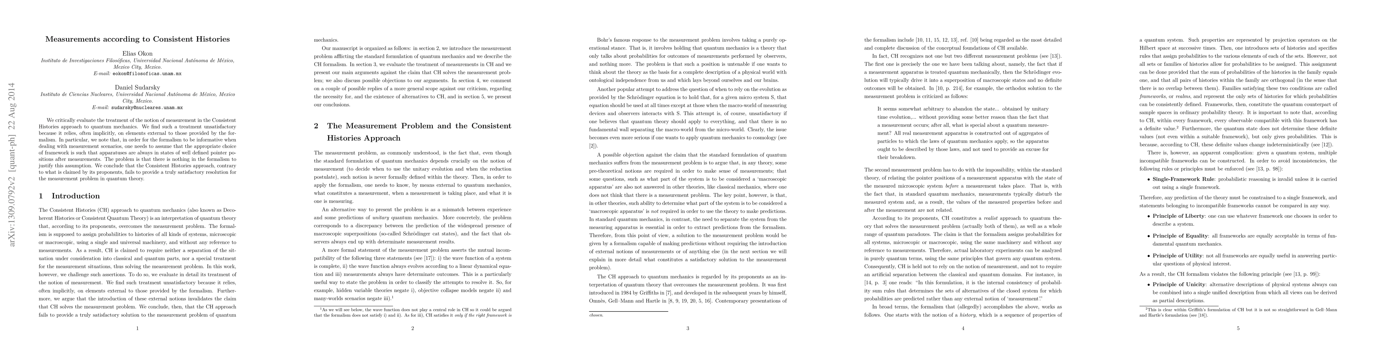 This paper critiques the Consistent Histories approach to quantum mechanics, finding its treatment of measurement unsatisfactory due to reliance on external assumptions. It concludes that the approach fails to adequately resolve the measurement problem in quantum theory.