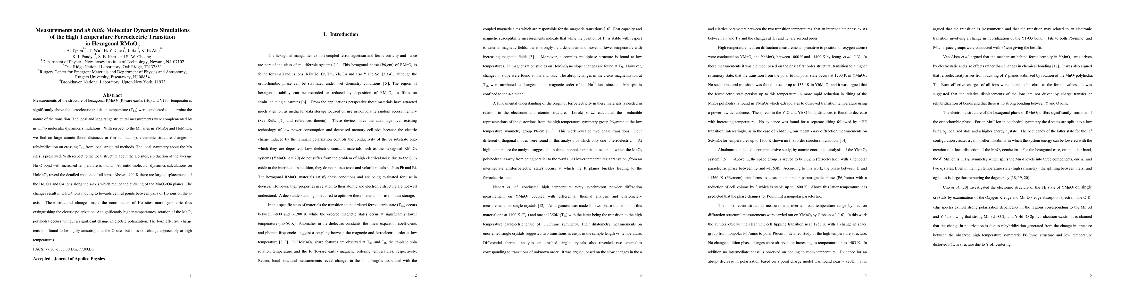 Measurements of the structure of hexagonal RMnO3 (R=rare earths (Ho) and Y) for temperatures significantly above the ferroelectric transition temperature (TFE) were conducted to determine the nature of the transition. The local and long range structural measurements were complemented by ab initio molecular dynamics simulations. With respect to the Mn sites in YMnO3 and HoMnO3, we find no large atomic (bond distances or thermal factors), electronic structure changes or rehybridization on crossing TFE from local structural methods. The local symmetry about the Mn sites is preserved. With respect to the local structure about the Ho sites, a reduction of the average Ho-O bond with increased temperature is found. Ab initio molecular dynamics calculations on HoMnO3 reveal the detailed motions of all ions. Above ~900 K there are large displacements of the Ho, O3 and O4 ions along the z-axis which reduce the buckling of the MnO3/O4 planes. The changes result in O3/O4 ions moving to towards central points between pairs of Ho ions on the z-axis. These structural changes make the coordination of Ho sites more symmetric thus extinguishing the electric polarization. At significantly higher temperatures, rotation of the MnO5 polyhedra occurs without a significant change in electric polarization. The born effective charge tensor is found to be highly anisotropic at the O sites but does not change appreciably at high temperatures.
