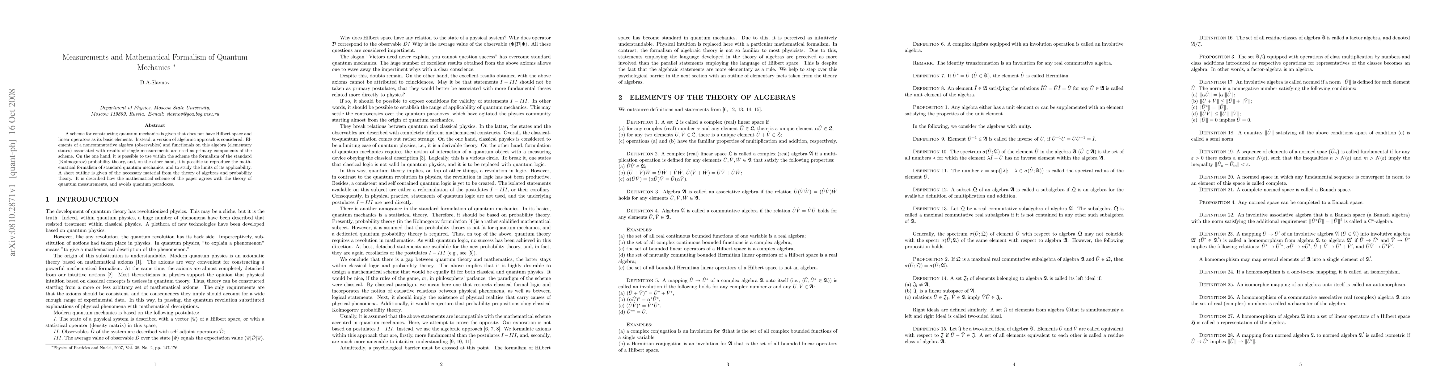 A scheme for constructing quantum mechanics is given that does not have Hilbert space and linear operators as its basic elements. Instead, a version of algebraic approach is considered. Elements of a noncommutative algebra (observables) and functionals on this algebra (elementary states) associated with results of single measurements are used as primary components of the scheme. On the one hand, it is possible to use within the scheme the formalism of the standard (Kolmogorov) probability theory, and, on the other hand, it is possible to reproduce the mathematical formalism of standard quantum mechanics, and to study the limits of its applicability. A short outline is given of the necessary material from the theory of algebras and probability theory. It is described how the mathematical scheme of the paper agrees with the theory of quantum measurements, and avoids quantum paradoxes.