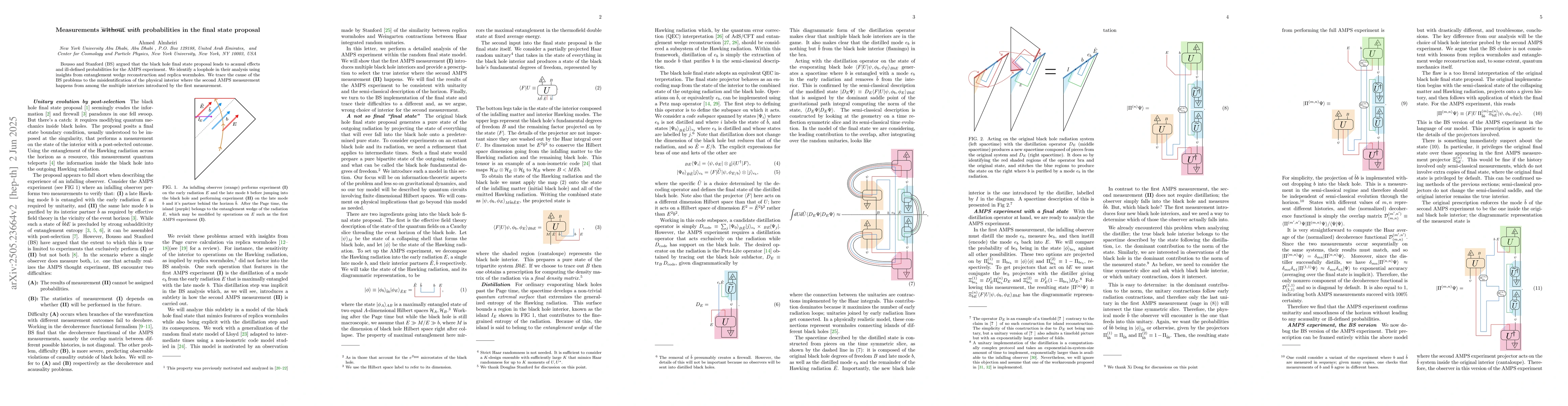 Bousso and Stanford (BS) argued that the black hole final state proposal leads to acausal effects and ill-defined probabilities for the AMPS experiment. We identify a loophole in their analysis using insights from entanglement wedge reconstruction and replica wormholes. We trace the cause of the BS problems to the misidentification of the physical interior where the second AMPS measurement happens from among the multiple interiors introduced by the first measurement.