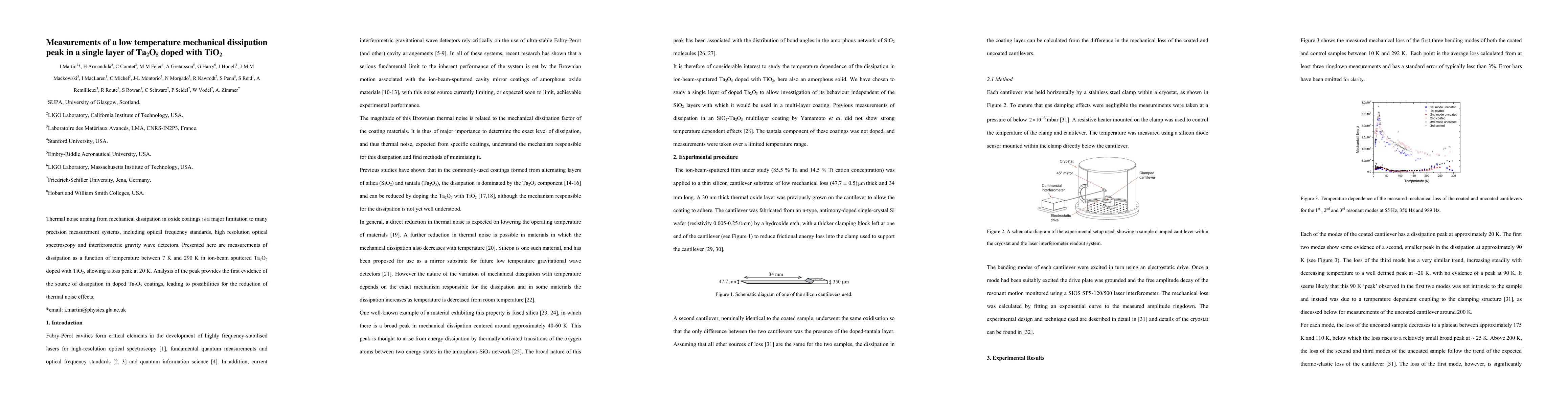 This paper reports measurements of mechanical dissipation in ion-beam sputtered Ta2O5 doped with TiO2, revealing a loss peak at 20 K. The analysis provides insights into the source of dissipation, potentially aiding in the reduction of thermal noise in precision measurement systems.