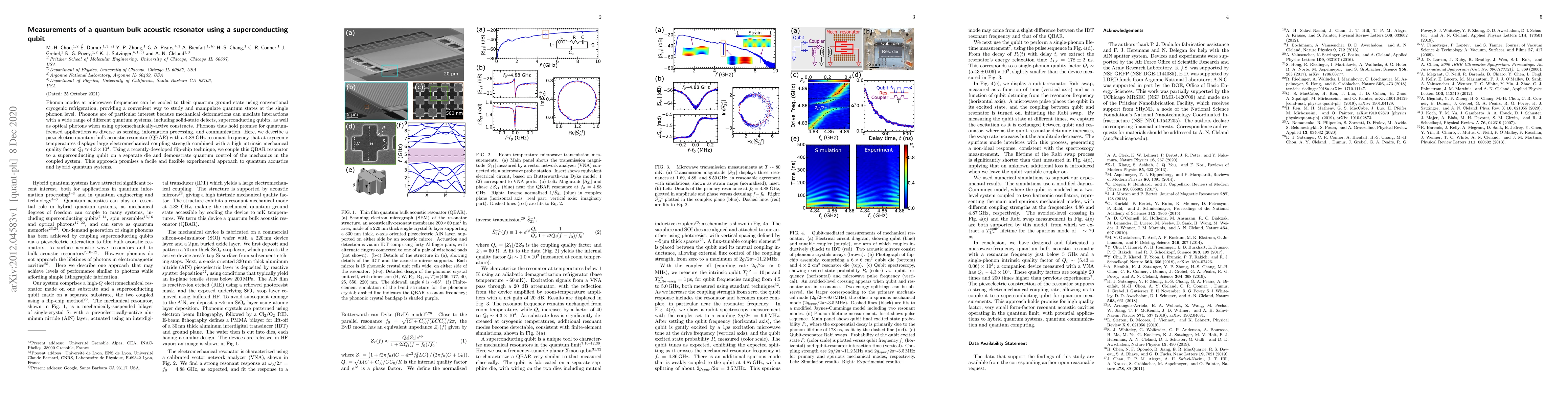 This paper details the measurement of phonons in a quantum bulk acoustic resonator (QBAR) coupled to a superconducting qubit, showcasing large electromechanical coupling and high intrinsic mechanical quality factor. The study employs a flip-chip technique to achieve quantum control, promising advancements in quantum acoustics and hybrid quantum systems.