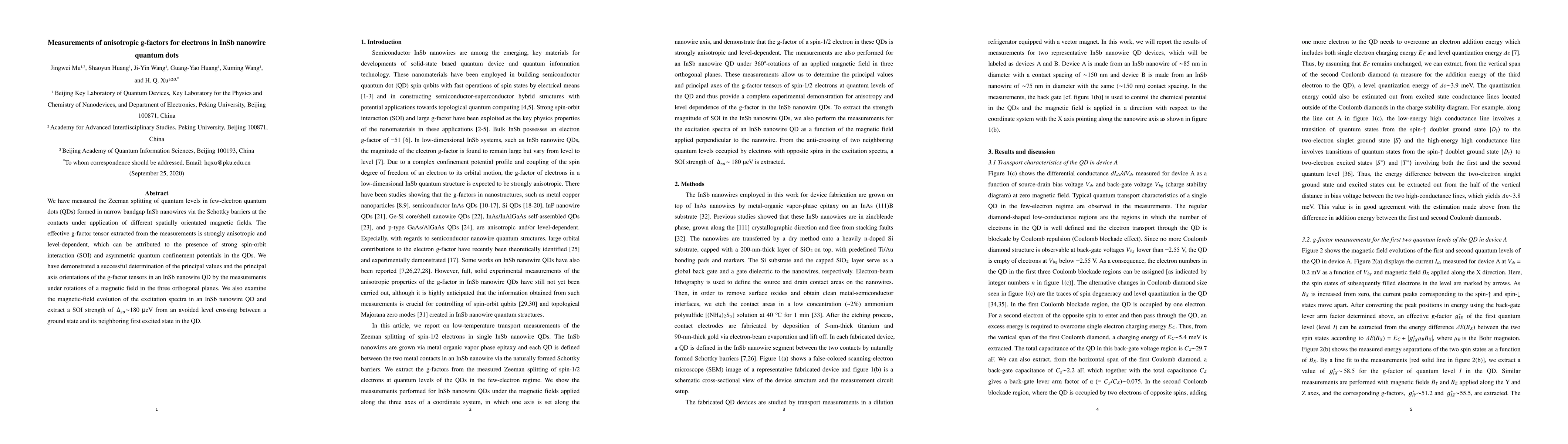 We have measured the Zeeman splitting of quantum levels in few-electron quantum dots (QDs) formed in narrow bandgap InSb nanowires via the Schottky barriers at the contacts under application of different spatially orientated magnetic fields. The effective g-factor tensor extracted from the measurements is strongly anisotropic and level-dependent, which can be attributed to the presence of strong spin-orbit interaction (SOI) and asymmetric quantum confinement potentials in the QDs. We have demonstrated a successful determination of the principal values and the principal axis orientations of the g-factor tensors in an InSb nanowire QD by the measurements under rotations of a magnetic field in the three orthogonal planes. We also examine the magnetic-field evolution of the excitation spectra in an InSb nanowire QD and extract a SOI strength of $\Delta_{so}\sim 180$ $\mu$eV from an avoided level crossing between a ground state and its neighboring first excited state in the QD.