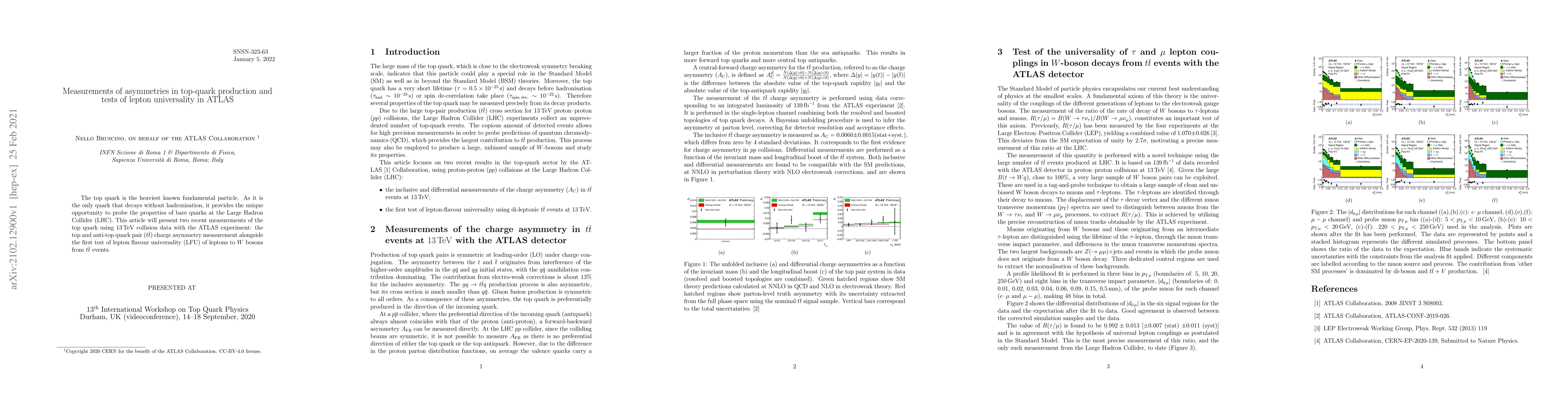 The ATLAS experiment measures top quark production asymmetry and tests lepton universality in high-energy collisions, providing insights into fundamental particle properties.