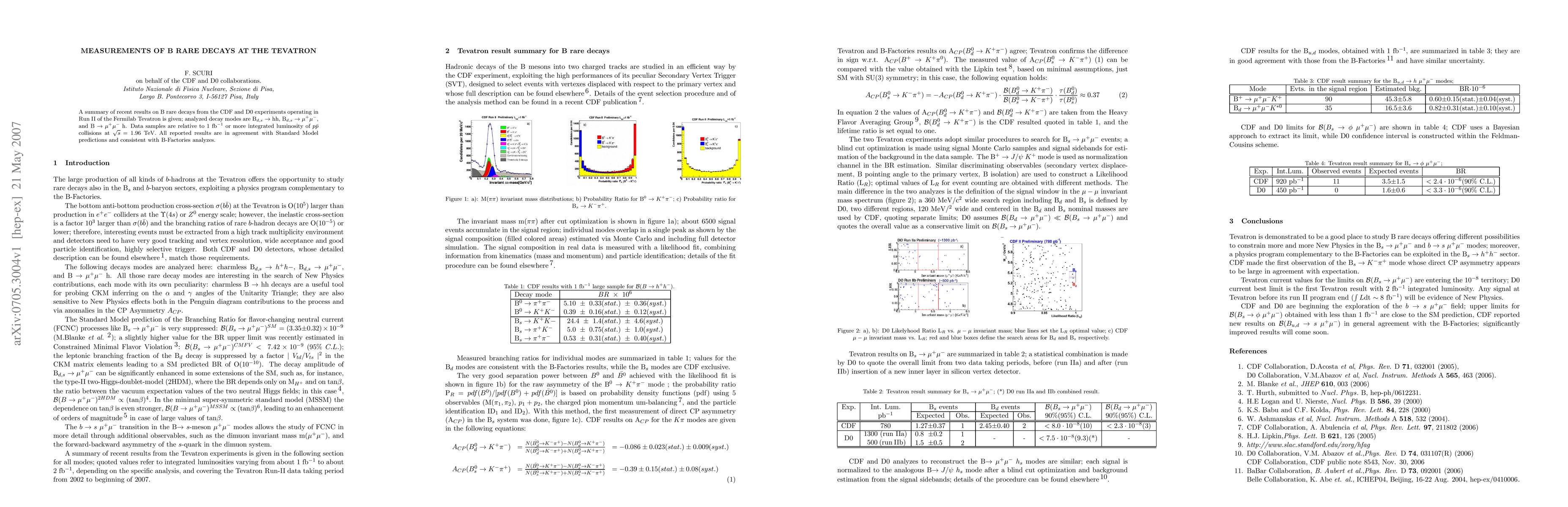 This paper summarizes recent findings on B rare decays from the CDF and D0 experiments at the Tevatron, focusing on decay modes B_{d,s}--> hh, B_{d,s}--> mu^{+}mu^{-}, and B--> mu^{+} mu^{-}h. The results, based on data from 1 fb^{-1} or more of integrated luminosity, align with Standard Model predictions and corroborate previous B-Factory analyses.