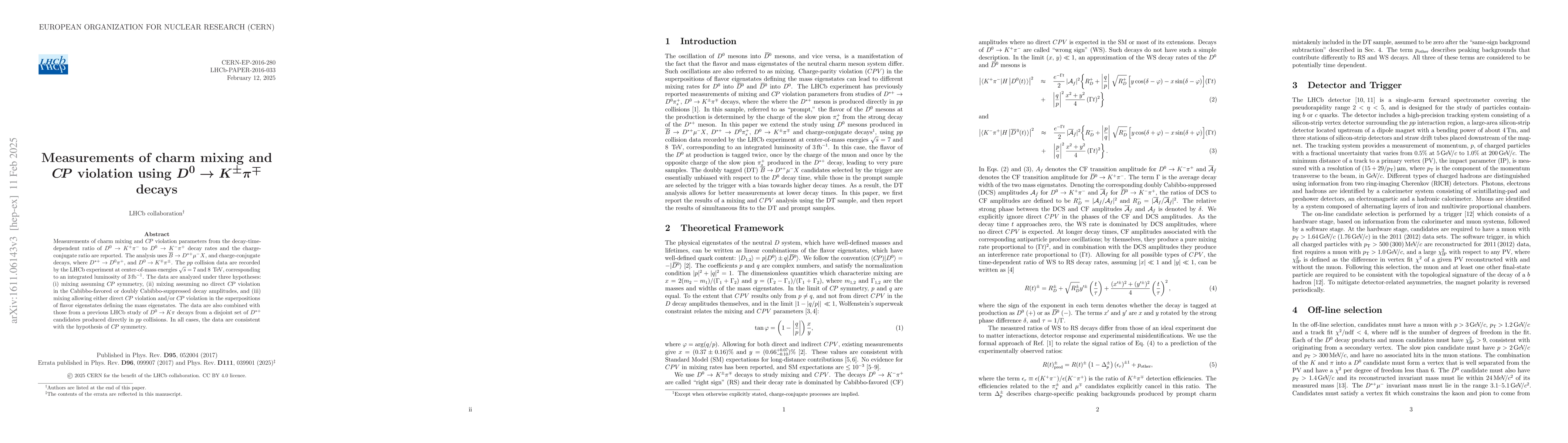 This paper reports measurements of charm mixing and $C\!P$ violation parameters from $D^0 \to K^\pm \pi^\mp$ decays using LHCb data at 7 and 8 TeV. The analysis supports the hypothesis of $C\!P$ symmetry in all tested scenarios.