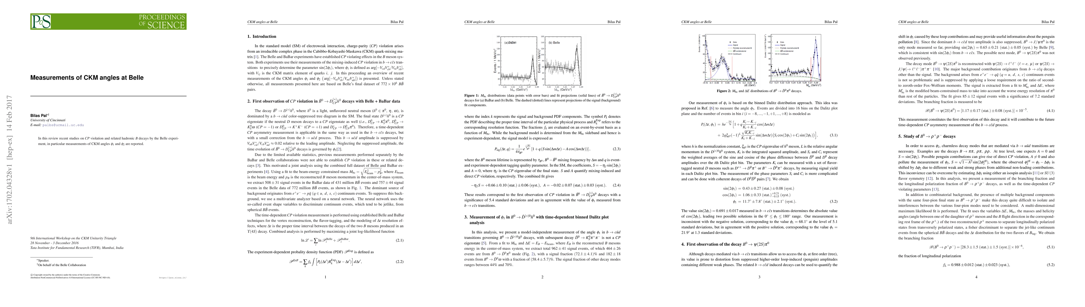 Summary: The Belle experiment reports recent findings on $CP$ violation through measurements of CKM angles $\phi_1$ and $\phi_2$ in hadronic $B$ decays, contributing to our understanding of the underlying mechanisms of $CP$ violation.