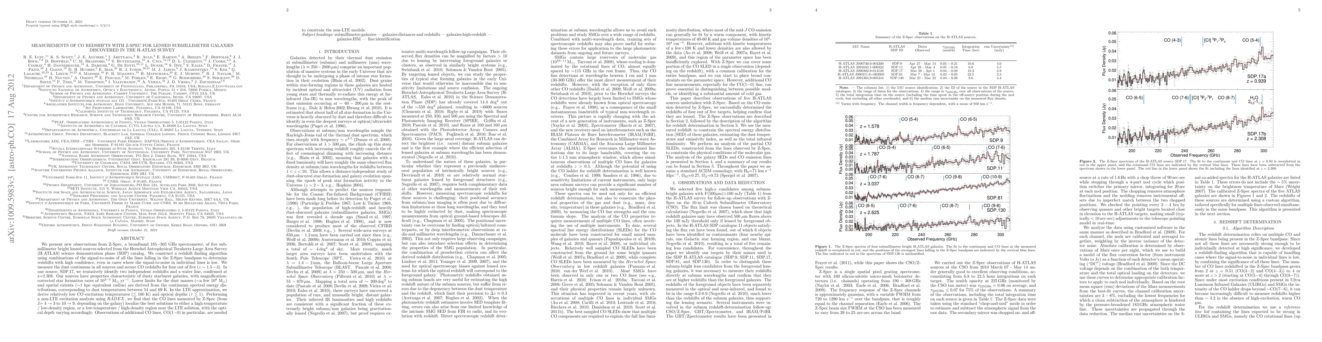We present new observations from Z-Spec, a broadband 185-305 GHz spectrometer, of five sub-millimeter bright lensed sources selected from the Herschel Astrophysical Terahertz Large Area Survey (H-ATLAS) science demonstration phase (SDP) catalog. We construct a redshift finding algorithm using combinations of the signal-to-noise of all the lines falling in the Z-Spec bandpass to determine redshifts with high confidence, even in cases where the signal-to-noise in individual lines is low. We measure the dust continuum in all sources and secure CO redshifts for four out of five (z~1.5-3). In one source, SDP.17, we tentatively identify two independent redshifts and a water line, confirmed at z=2.308. Our sources have properties characteristic of dusty starburst galaxies, with magnification-corrected star formation rates of 10^(2-3) M_sun/yr. Lower limits for the dust masses (~a few 10^8 M_sun) and spatial extents (~1 kpc equivalent radius) are derived from the continuum spectral energy distributions, corresponding to dust temperatures between 54 and 69K. In the LTE approximation, we derive relatively low CO excitation temperatures (< 100 K) and optical depths (tau<1). Performing a non-LTE excitation analysis using RADEX, we find that the CO lines measured by Z-Spec (from J=4->3 to 10->9, depending on the galaxy) localize the best solutions to either a high-temperature / low-density region, or a low-temperature / high-density region near the LTE solution, with the optical depth varying accordingly. Observations of additional CO lines, CO(1-0) in particular, are needed to constrain the non-LTE models.