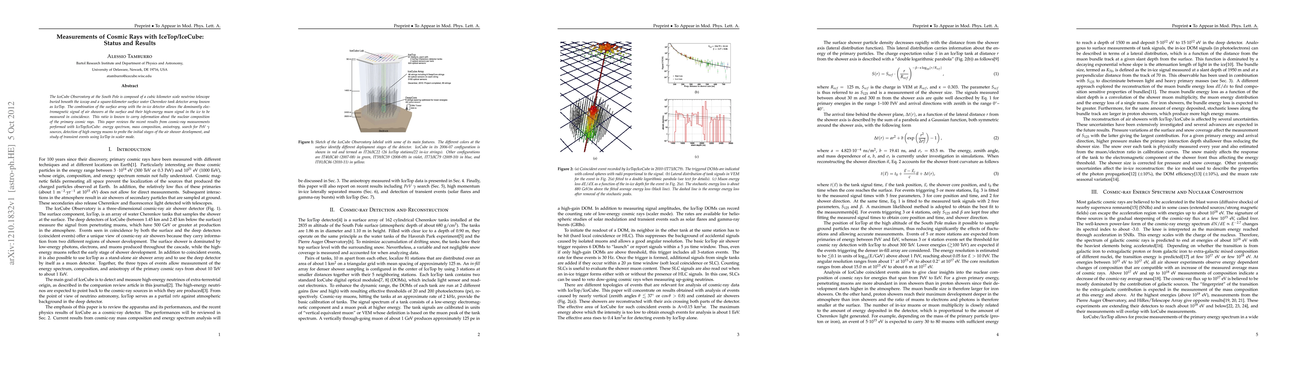 The IceCube Observatory, comprising a cubic kilometer in-ice detector and a square-kilometer surface IceTop array, measures cosmic rays by detecting both electromagnetic signals at the surface and high-energy muon signals in the ice, allowing for the determination of cosmic ray properties such as energy spectrum, mass composition, and anisotropy.