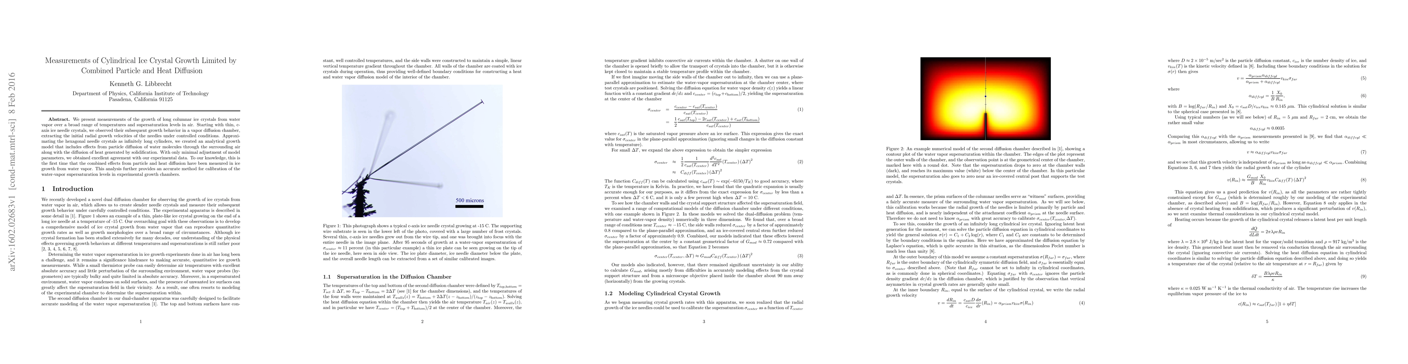 This study measures the growth of long ice crystal needles from water vapor, observing their radial expansion under controlled conditions. The researchers developed an analytical model incorporating both particle and heat diffusion effects, achieving excellent agreement with experimental data, thus providing a new method for calibrating supersaturation levels in growth chambers.