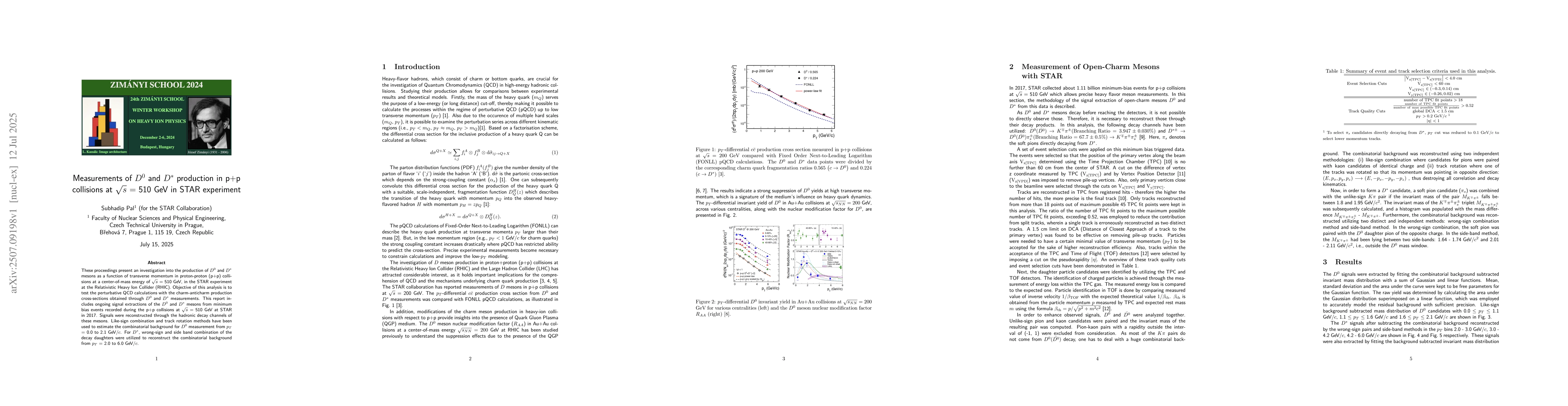 These proceedings present an investigation into the production of $D^{0}$ and $D^{*}$ mesons as a function of transverse momentum in proton-proton (p+p) collisions at a center-of-mass energy of $\sqrt{s}$ = 510 GeV, in the STAR experiment at the Relativistic Heavy Ion Collider (RHIC). Objective of this analysis is to test the perturbative QCD calculations with the charm-anticharm production cross-sections obtained through $D^{0}$ and $D^{*}$ measurements. This report includes ongoing signal extractions of the $D^{0}$ and $D^{*}$ mesons from minimum bias events recorded during the p+p collisions at $\sqrt{s}$ = 510 GeV at STAR in 2017. Signals were reconstructed through the hadronic decay channels of these mesons. Like-sign combination and track rotation methods have been used to estimate the combinatorial background for $D^{0}$ measurement from $p_{T}$ = 0.0 to 2.1 GeV/$c$. For $D^{*}$, wrong-sign and side band combination of the decay daughters were utilized to reconstruct the combinatorial background from $p_{T}$ = 2.0 to 6.0 GeV/$c$.