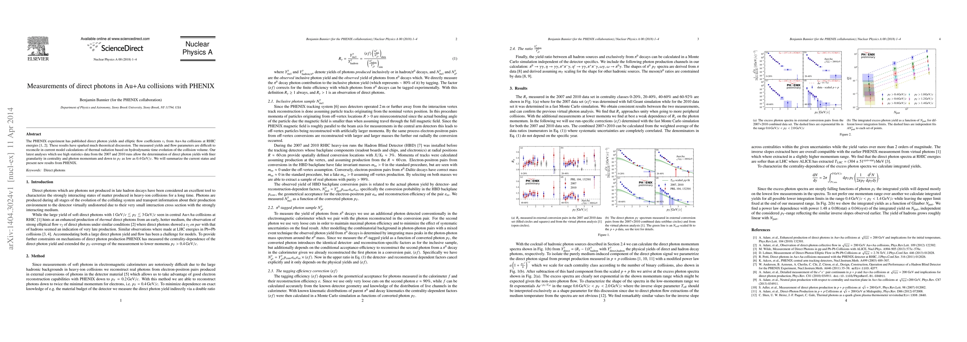 PHENIX experiment measured direct photons in Au+Au collisions using external conversion pairs from electron-positron pairs in detector material, reconstructing photons down to 0.4 GeV/c. Direct photon yield was determined indirectly via a double ratio to minimize detector-specific dependencies.