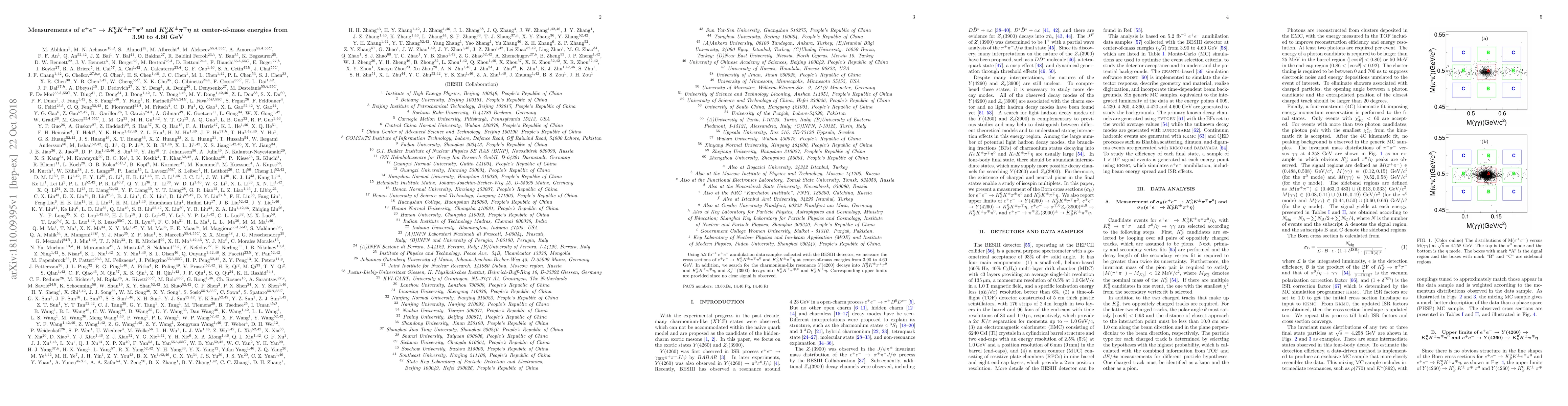 Using $5.2 \ \mathrm{fb}^{-1}$ $e^+ e^-$ annihilation data samples collected with the BESIII detector, we measure the cross sections of $e^+e^- \to K_S^0 K^\pm \pi^\mp \pi^0$ and $K_{S}^{0}K^{\pm}\pi^{\mp}\eta$ at center-of-mass energies from $3.90$ to $4.60$ GeV. In addition, we search for the charmonium-like resonance $Y(4260)$ decays into $K_{S}^{0}K^{\pm}\pi^{\mp}\pi^0$ and $K_{S}^{0}K^{\pm}\pi^{\mp}\eta$, and $Z_c^{0,\pm}(3900)$ decays into $K_{S}^{0}K^{\pm}\pi^{\mp,0}$ and $K_{S}^{0}K^{\pm}\eta$. Corresponding upper limits are provided since no clear signal is observed.