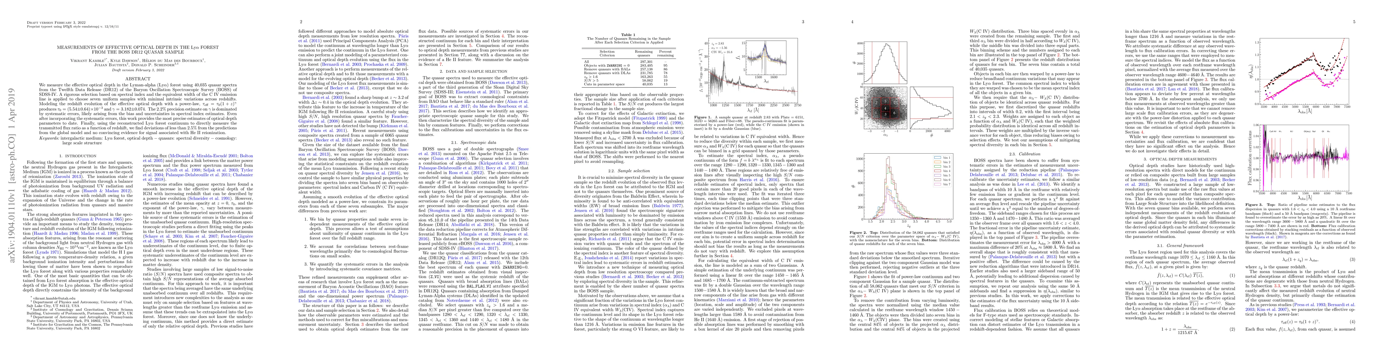 We measure the effective optical depth in the Lyman-alpha (Ly$\alpha$) forest using 40,035 quasar spectra from the Twelfth Data Release (DR12) of the Baryon Oscillation Spectroscopic Survey (BOSS) of SDSS-IV. A rigorous selection based on spectral index and the equivalent width of the C IV emission line is applied to choose seven uniform samples with minimal intrinsic variations across redshifts. Modeling the redshift evolution of the effective optical depth with a power-law, $\tau_\mathrm{eff}=\tau_0 (1 + z)^\gamma$ produces $\tau_0=(5.54 \pm 0.64)\times 10^{-3}$ and $\gamma=3.182 \pm 0.074$. The 2.2% precision estimate on $\gamma$ is dominated by systematic errors, likely arising from the bias and uncertainties in spectral index estimates. Even after incorporating the systematic errors, this work provides the most precise estimates of optical depth parameters to date. Finally, using the reconstructed Ly$\alpha$ forest continuum to directly measure the transmitted flux ratio as a function of redshift, we find deviations of less than 2.5% from the predictions from the global model and no convincing evidence for signal associated with He II reionization.