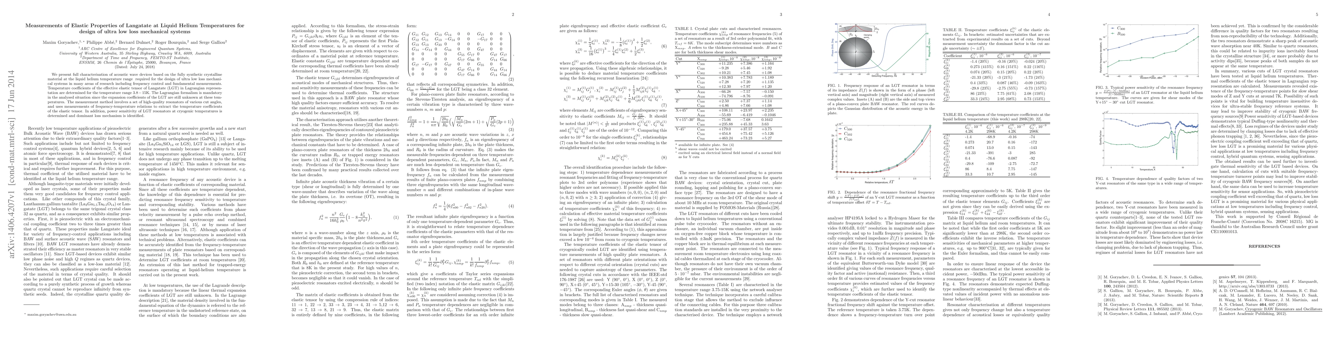 We present full characterisation of acoustic wave devices based on the fully synthetic crystalline material at the liquid helium temperature range { required for the design of ultra low loss mechanical systems in many areas of research including frequency control and fundamental measurements}. Temperature coefficients of the effective elastic tensor of Langatate (LGT) in Lagrangian representation are determined for the temperature range $3.8-15$K. The Lagrangian formalism is mandatory in the analysed situation since the expansion coefficients of the LGT are still unknown at these temperatures. The measurement method involves a set of high-quality resonators of various cut angles, and uses measurements of frequency-temperature relations to extract the temperature coefficients of the elastic tensor. In addition, power sensitivity of LGT resonators at cryogenic temperatures is determined and dominant loss mechanism is identified.