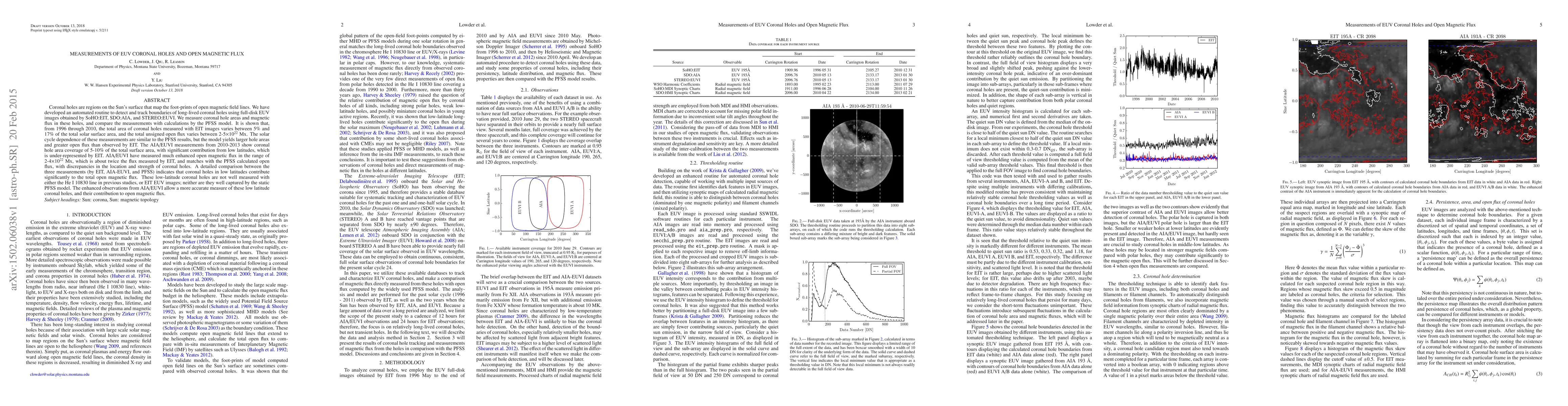 This study measures and tracks coronal holes using EUV images from SoHO:EIT, SDO:AIA, and STEREO:EUVI, finding that their areas and open magnetic flux vary significantly over the solar cycle. While EIT measurements show a total coronal hole area of 5-17% of the solar surface, AIA/EUVI data from 2010-2013 reveal a lower but more accurate representation of low-latitude coronal holes, contributing significantly to open magnetic flux.