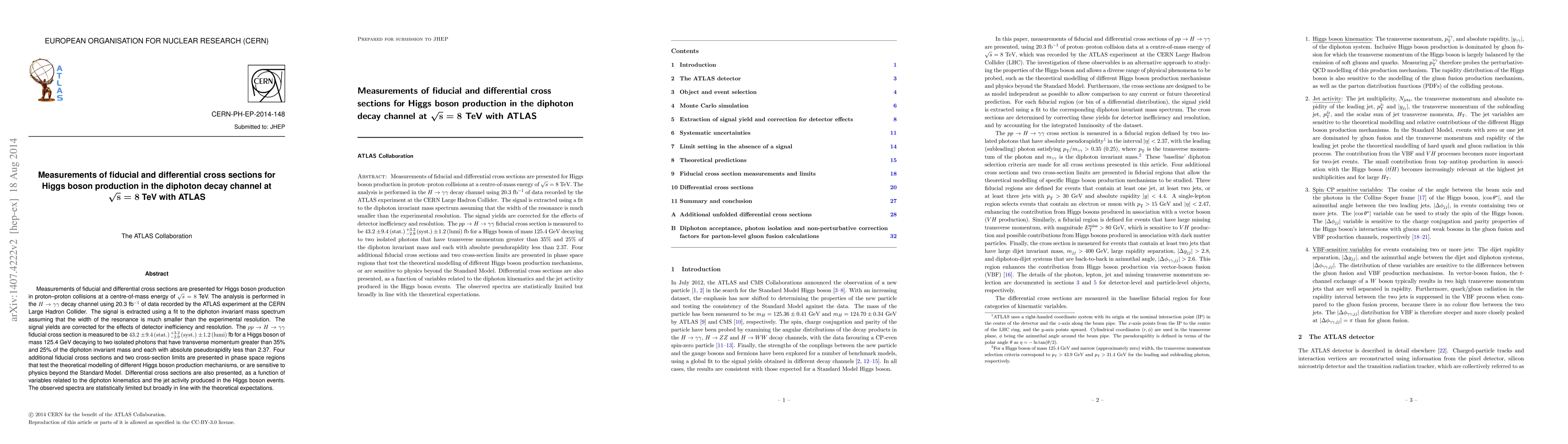 This paper reports measurements of fiducial and differential cross sections for Higgs boson production in the diphoton decay channel at $\sqrt{s}=8$ TeV using the ATLAS experiment. The analysis, based on 20.3 fb$^{-1}$ of data, finds the fiducial cross section to be $43.2 \pm 9.4$ fb, with additional tests on theoretical models and potential physics beyond the Standard Model.