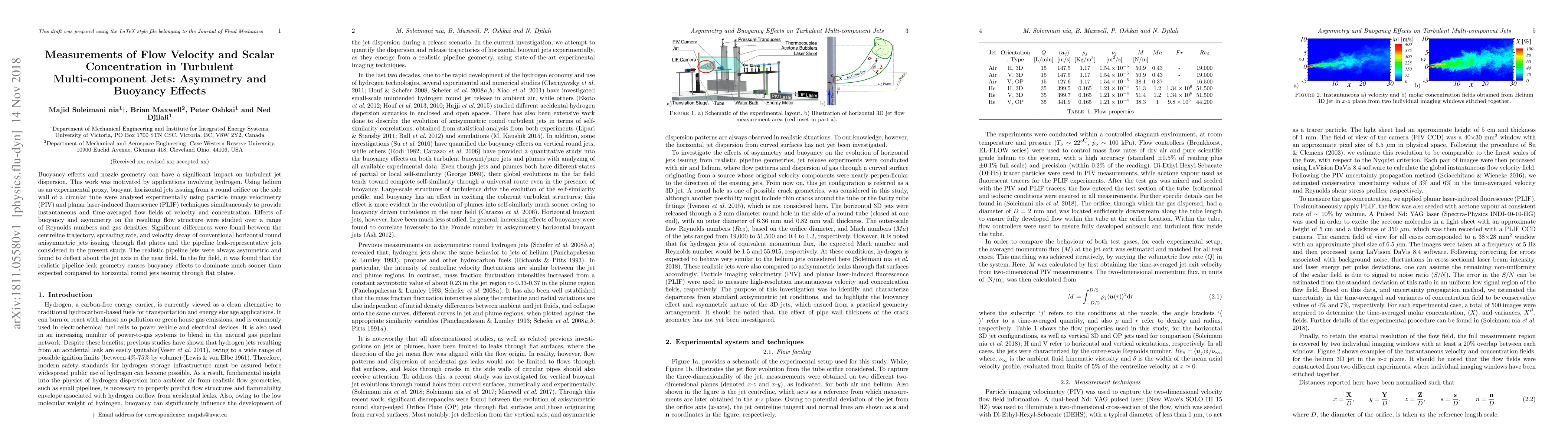 Buoyancy effects and nozzle geometry can have a significant impact on turbulent jet dispersion. This work was motivated by applications involving hydrogen. Using helium as an experimental proxy, buoyant horizontal jets issuing from a round orifice on the side wall of a circular tube were analysed experimentally using particle image velocimetry (PIV) and planar laser-induced fluorescence (PLIF) techniques simultaneously to provide instantaneous and time-averaged flow fields of velocity and concentration. Effects of buoyancy and asymmetry on the resulting flow structure were studied over a range of Reynolds numbers and gas densities. Significant differences were found between the centreline trajectory, spreading rate, and velocity decay of conventional horizontal round axisymmetric jets issuing through flat plates and the pipeline leak-representative jets considered in the present study. The realistic pipeline jets were always asymmetric and found to deflect about the jet axis in the near field. In the far field, it was found that the realistic pipeline leak geometry causes buoyancy effects to dominate much sooner than expected compared to horizontal round jets issuing through flat plates.