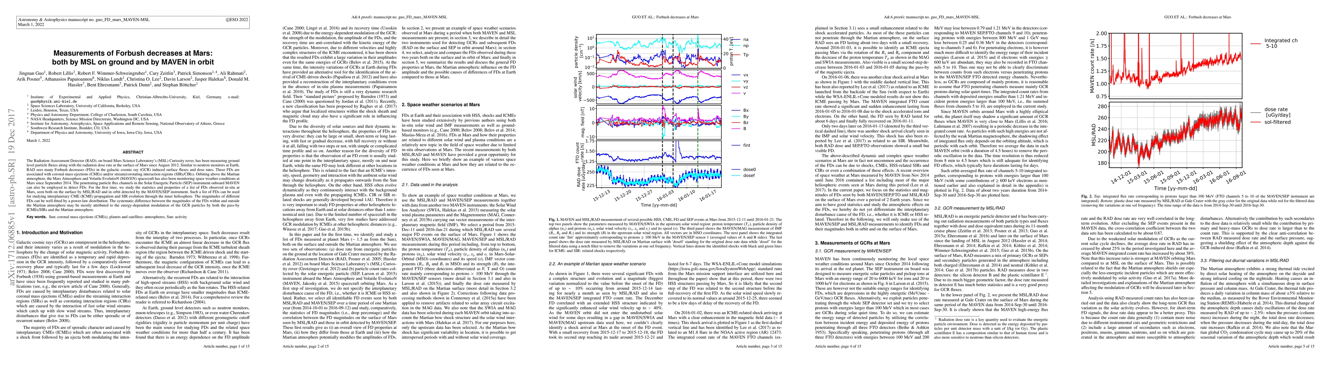 This paper investigates Forbush decreases (FDs) in galactic cosmic rays observed both on the Martian surface by MSL/RAD and in orbit by MAVEN/SEP. The study finds that the magnitudes of these FDs follow a power-law distribution, with differences in their magnitudes attributed to the energy-dependent modulation by interplanetary phenomena and the Martian atmosphere.