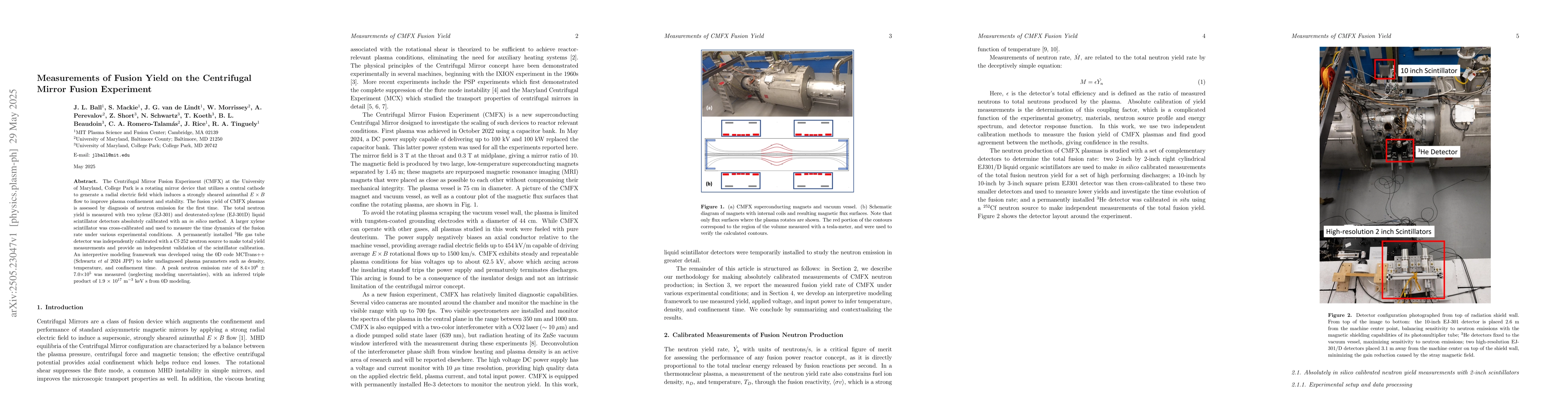 The research utilized the Centrifugal Mirror Fusion Experiment (CMFX) at the University of Maryland, College Park, employing a rotating mirror device with a central cathode to generate a radial electric field. This induces a strongly sheared azimuthal $E\times B$ flow to enhance plasma confinement and stability. Neutron emission was diagnosed to assess the fusion yield, using absolute calibration with an in silico method for two xylene (EJ-301) and deuterated-xylene (EJ-301D) liquid scintillator detectors. A $^3$He gas tube detector provided independent validation. An interpretive modeling framework using MCTrans++ inferred plasma parameters.