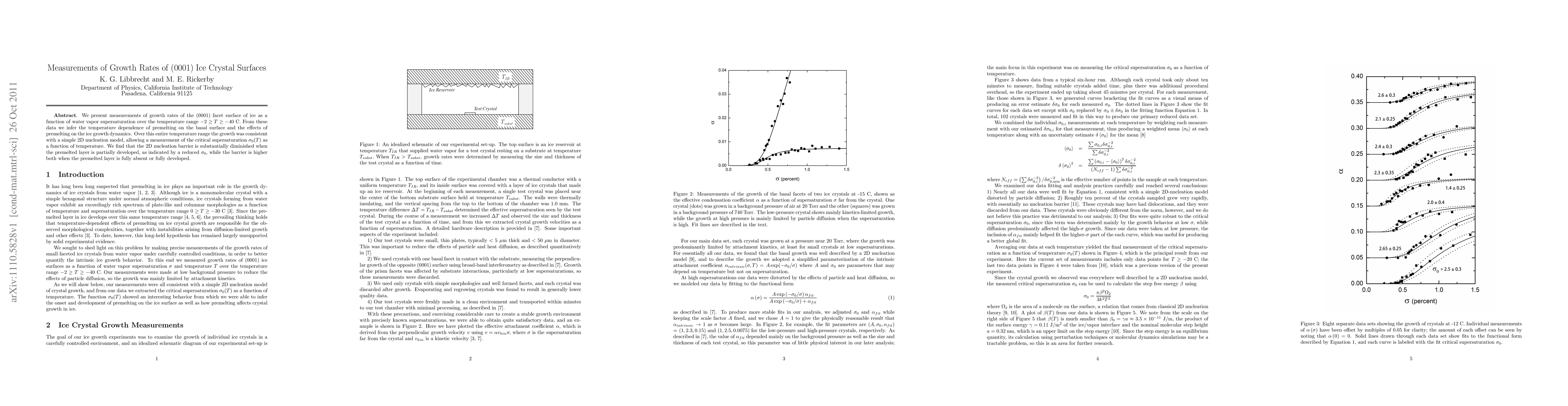 This study measures the growth rates of (0001) ice crystal surfaces under varying water vapor supersaturations, revealing a temperature-dependent premelting effect. The findings support a 2D nucleation model, showing a reduced nucleation barrier when a premelted layer partially forms.