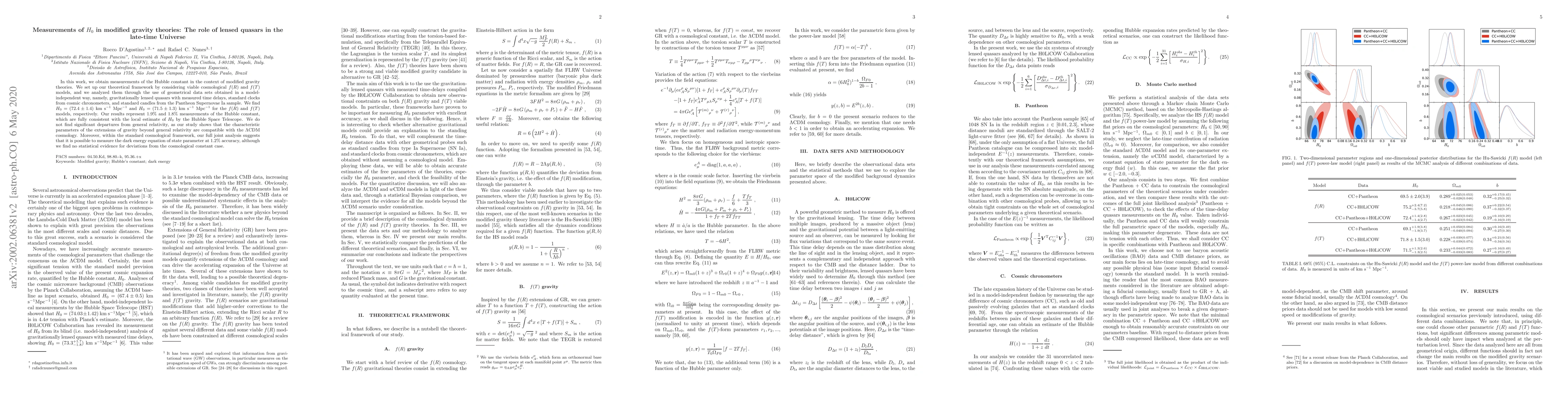 This study measures the Hubble constant (H_0) in modified gravity theories using lensed quasars, cosmic chronometers, and supernovae data. The results, H_0=(72.4±1.4) km/s/Mpc for f(R) and H_0=(71.5±1.3) km/s/Mpc for f(T), are consistent with local estimates and show no significant departures from general relativity. The analysis also suggests a 1.2% accuracy in measuring the dark energy equation of state parameter within the standard cosmological framework, finding no evidence for deviations from the cosmological constant case.