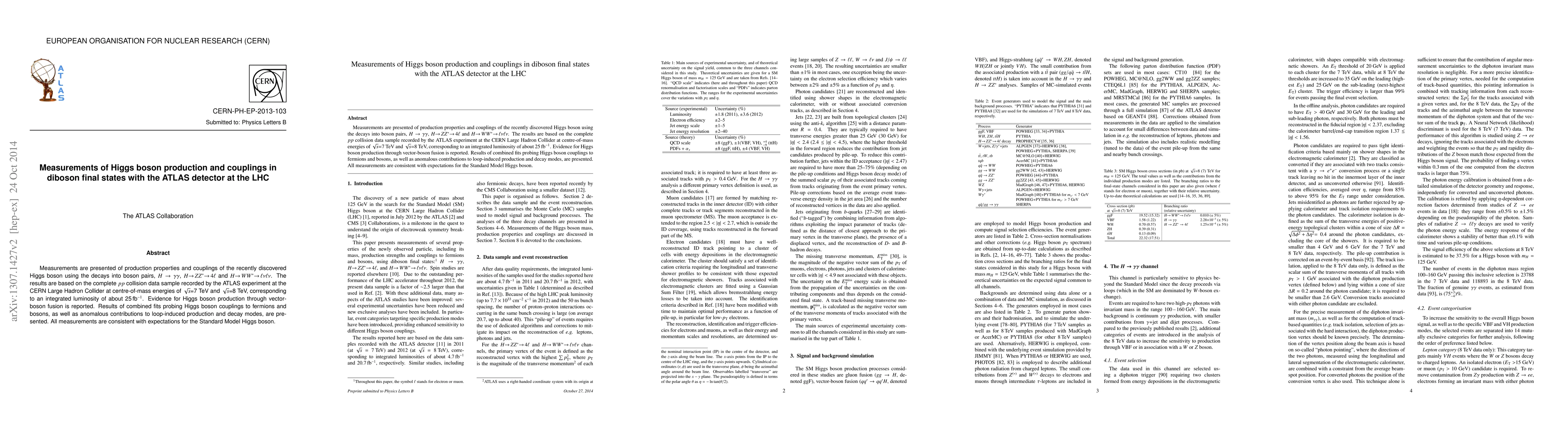 This paper reports measurements of the Higgs boson production and couplings using diboson decay channels with the ATLAS detector at the LHC, analyzing data from 7 TeV and 8 TeV collisions. All findings are consistent with Standard Model predictions, including evidence for vector-boson fusion production.
