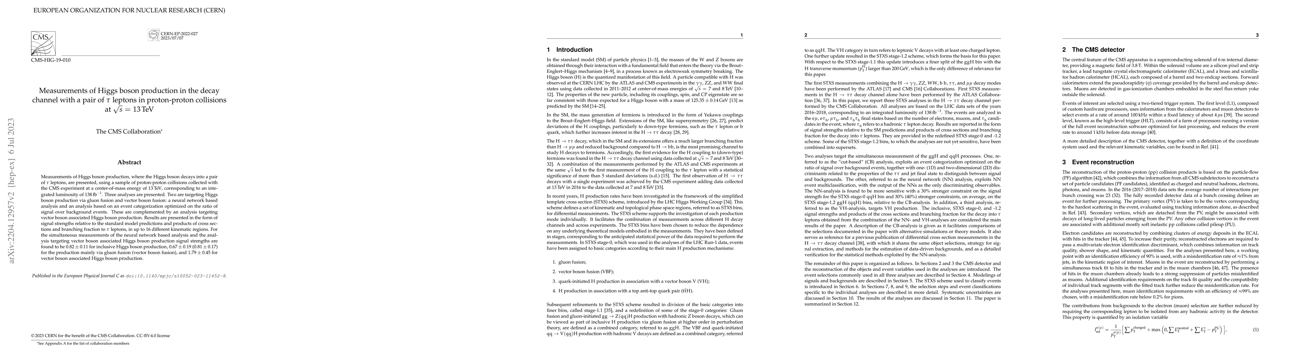 This paper presents measurements of Higgs boson production decaying into a pair of $\tau$ leptons in proton-proton collisions at 13 TeV, using the CMS experiment. Results show signal strengths relative to standard model predictions, with values ranging from 0.67 to 1.79, depending on the production mechanism.