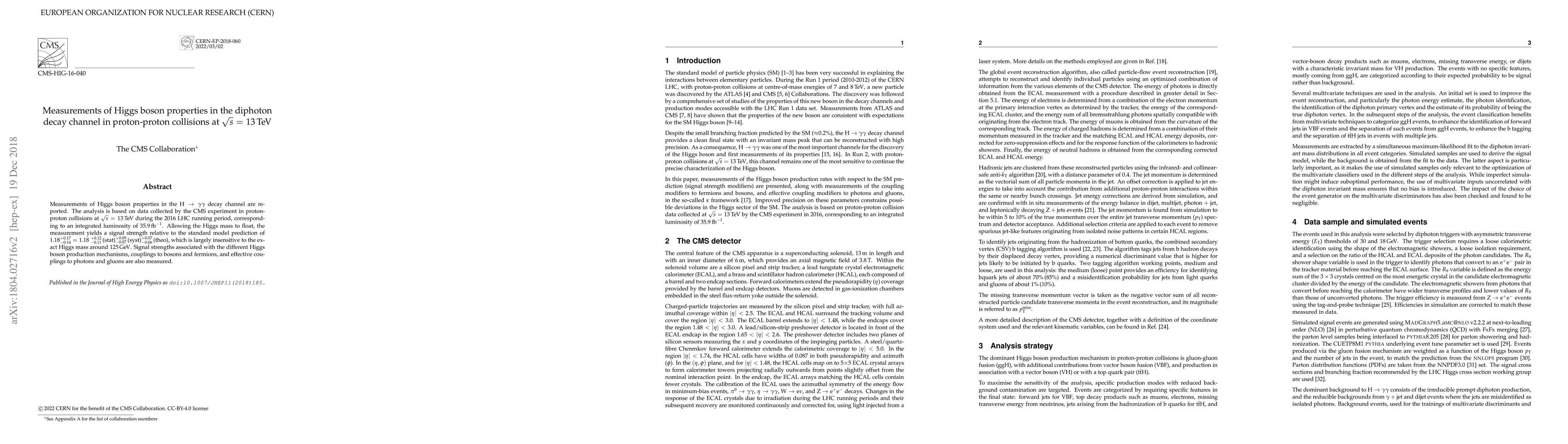 This paper reports measurements of Higgs boson properties via its decay into two photons in proton-proton collisions at 13 TeV, using data from the CMS experiment. The analysis yields a signal strength of 1.18, consistent with the Standard Model predictions.