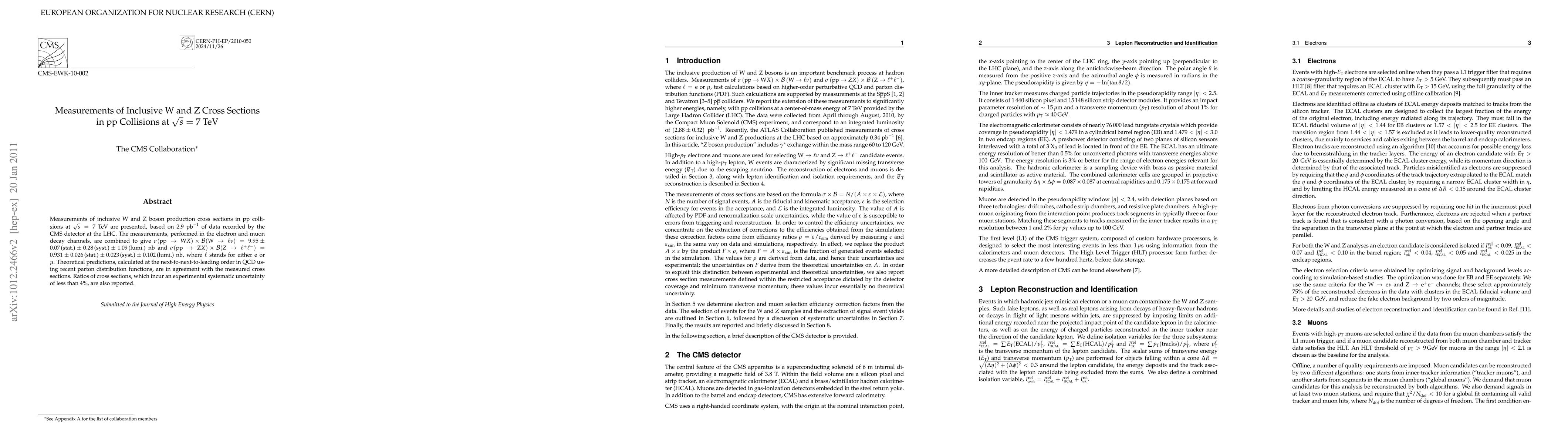 The CMS detector at the LHC measured inclusive W and Z boson production cross sections in proton-proton collisions at 7 TeV, combining electron and muon decay channels, yielding precise results in agreement with next-to-next-to-leading order QCD predictions. The cross section ratios have systematic uncertainties under 4%.