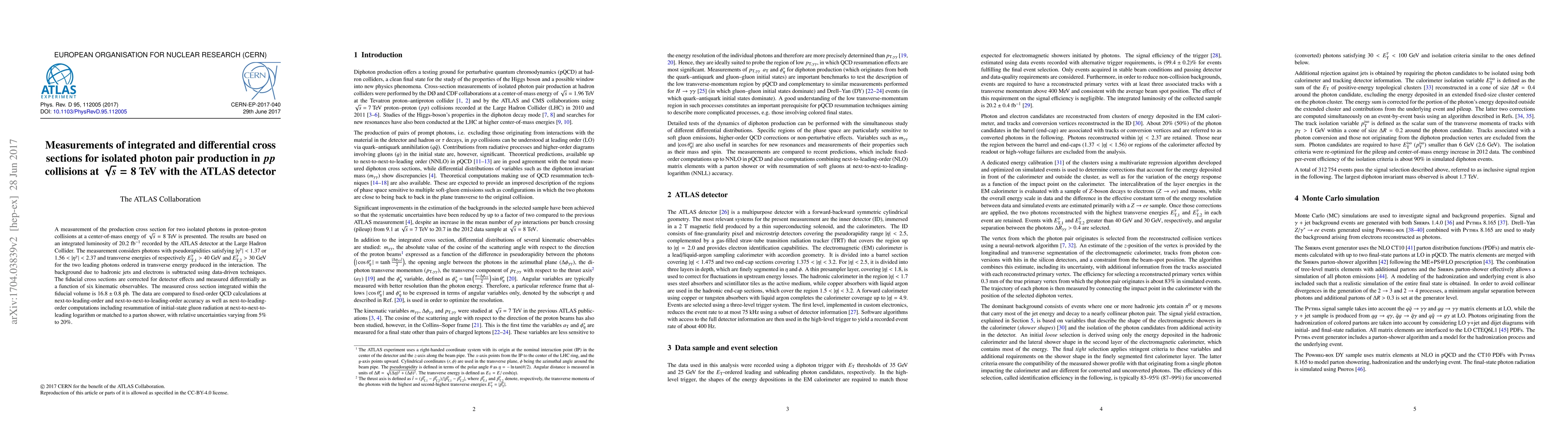 Researchers at ATLAS measured the production cross section for two isolated photons in proton-proton collisions at 8 TeV, obtaining an integrated cross section of 16.8 ± 0.8 pb, with results compared to various QCD calculations and varying uncertainties.