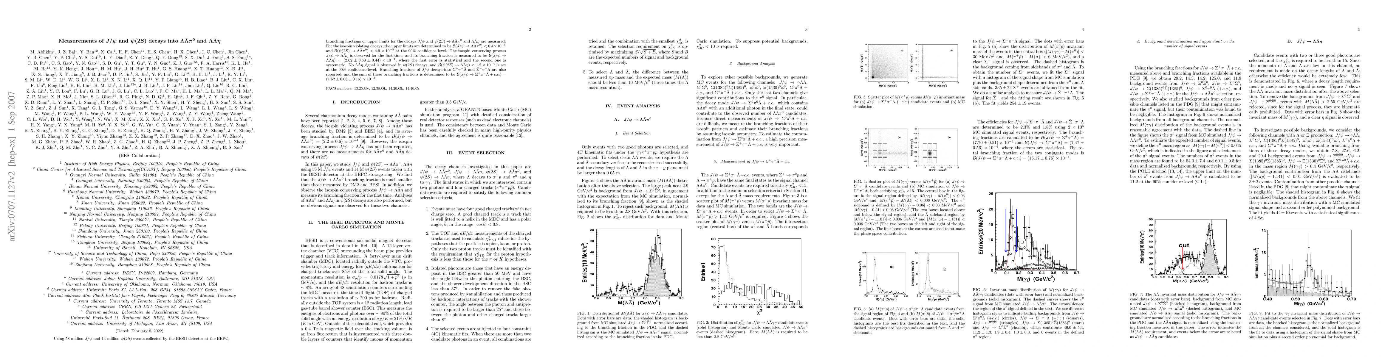 Using 58 million $J/\psi$ and 14 million $\psi(2S)$ events collected by the BESII detector at the BEPC, branching fractions or upper limits for the decays $J/\psi$ and $\psi(2S) \to \Lambda \bar{\Lambda}\pi^0$ and $\Lambda \bar{\Lambda}\eta$ are measured. For the isospin violating decays, the upper limits are determined to be ${\cal B}(J/\psi \to \Lambda \bar{\Lambda}\pi^0)<6.4\times 10^{-5}$ and ${\cal B}(\psi(2S) \to \Lambda \bar{\Lambda}\pi^0)<4.9\times 10^{-5}$ at the 90% confidence level. The isospin conserving process $J/\psi \to \Lambda \bar{\Lambda}\eta$ is observed for the first time, and its branching fraction is measured to be ${\cal B}(J/\psi \to \Lambda \bar{\Lambda}\eta)=(2.62\pm 0.60\pm 0.44)\times 10^{-4}$, where the first error is statistical and the second one is systematic. No $\Lambda \bar{\Lambda}\eta$ signal is observed in $\psi(2S)$ decays, and ${\cal B}(\psi(2S) \to \Lambda \bar{\Lambda}\eta)<1.2\times 10^{-4}$ is set at the 90% confidence level. Branching fractions of $J/\psi$ decays into $\Sigma^+ \pi^- bar{\Lambda}$ and $\bar{\Sigma}^- \pi^+ \Lambda$ are also reported, and the sum of these branching fractions is determined to be ${\cal B}(J/\psi \to \Sigma^+\pi^- \bar{\Lambda} + c.c.)=(1.52\pm 0.08\pm 0.16)\times 10^{-3}$.