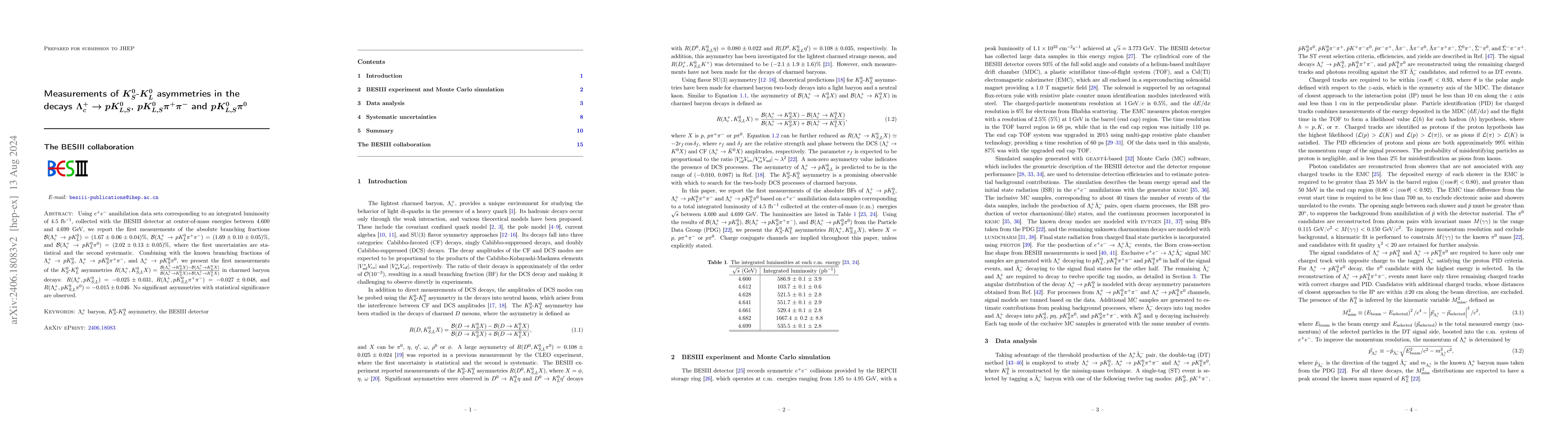 Using $e^+e^-$ annihilation data sets corresponding to an integrated luminosity of 4.5 $\text{fb}^{-1}$, collected with the BESIII detector at center-of-mass energies between 4.600 and 4.699 GeV, we report the first measurements of the absolute branching fractions $\mathcal{B}(\Lambda_c^+\to pK_{L}^{0})=(1.67 \pm 0.06 \pm 0. 04)\%$, $\mathcal{B}(\Lambda_c^+\to pK_{L}^{0}\pi^+\pi^-)=(1.69 \pm 0.10 \pm 0.05)\%$, and $\mathcal{B}(\Lambda_c^+\to pK_{L}^{0}\pi^0)=(2.02 \pm 0.13 \pm 0.05)\%$, where the first uncertainties are statistical and the second systematic. Combining with the known branching fractions of $\Lambda_c^+ \to pK_{S}^{0}$, $\Lambda_c^+ \to pK_{S}^{0}\pi^+\pi^-$, and $\Lambda_c^+ \to pK_{S}^{0}\pi^0$, we present the first measurements of the $K_{S}^{0}$-$K_{L}^{0}$ asymmetries $R(\Lambda_c^+, K_{S,L}^0X) = \frac{\mathcal{B}(\Lambda_c^+ \to K_{S}^{0} X) - \mathcal{B}(\Lambda_c^+ \to K_{L}^{0} X)}{\mathcal{B}(\Lambda_c^+ \to K_{S}^{0} X) + \mathcal{B}(\Lambda_c^+ \to K_{L}^{0} X)}$ in charmed baryon decays: $R(\Lambda_c^+, pK_{S,L}^0) = -0.025 \pm 0.031$, $R(\Lambda_c^+, pK_{S,L}^0\pi^+\pi^-) = -0.027 \pm 0.048$, and $R(\Lambda_c^+, pK_{S,L}^0\pi^0) =-0.015 \pm 0.046$. No significant asymmetries within the uncertainties are observed.