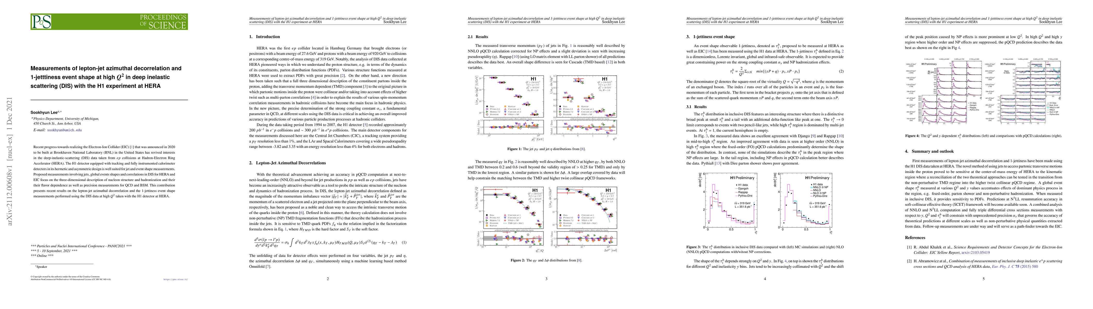 Recent progress towards realizing the Electron-Ion Collider (EIC) that was announced in 2020 to be built at Brookhaven National Laboratory (BNL) in the United States has revived interests in the deep-inelastic-scattering (DIS) data taken from $ep$ collisions at Hadron-Electron Ring Accelerator (HERA). The H1 detector equipped with tracking and fully instrumented calorimeter detectors in its hermetic and asymmetric design is well suited for jet and event shape measurements. Proposed measurements involving jets, global events shapes and correlations in DIS for HERA and EIC focus on the three-dimensional description of nucleon structure and hadronization and their their flavor dependence as well as precision measurements for QCD and BSM. This contribution presents recent results on the lepton-jet azimuthal decorrelation and the 1-jettiness event shape measurements performed using the DIS data at high $Q^2$ taken with the H1 detector at HERA.