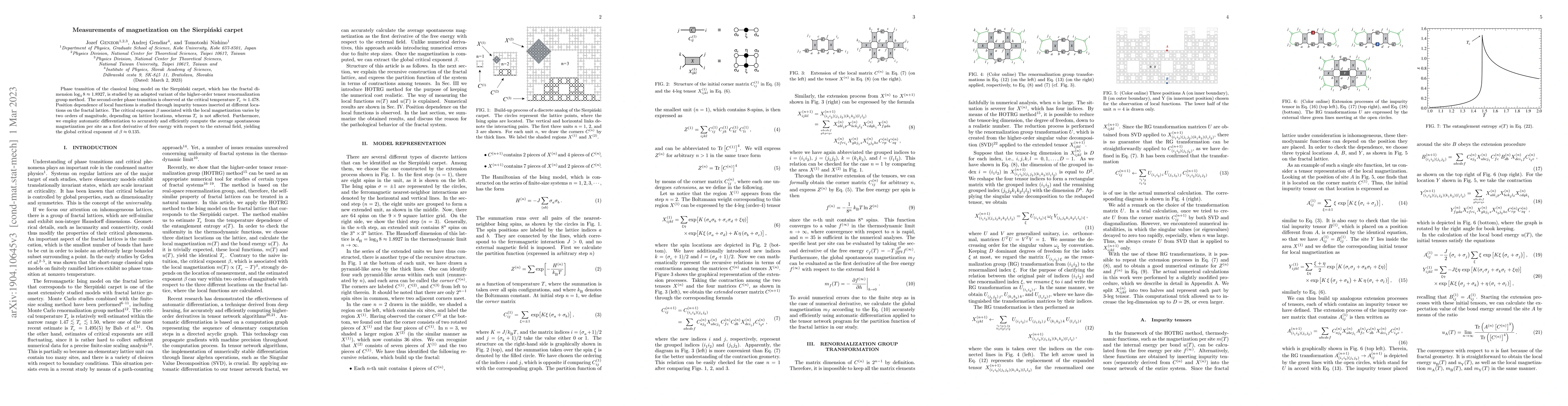 Phase transition of the classical Ising model on the Sierpi\'{n}ski carpet, which has the fractal dimension $\log_3^{~} 8 \approx 1.8927$, is studied by an adapted variant of the higher-order tensor renormalization group method. The second-order phase transition is observed at the critical temperature $T_{\rm c}^{~} \approx 1.478$. Position dependence of local functions is studied through impurity tensors inserted at different locations on the fractal lattice. The critical exponent $\beta$ associated with the local magnetization varies by two orders of magnitude, depending on lattice locations, whereas $T_{\rm c}^{~}$ is not affected. Furthermore, we employ automatic differentiation to accurately and efficiently compute the average spontaneous magnetization per site as a first derivative of free energy with respect to the external field, yielding the global critical exponent of $\beta \approx 0.135$.