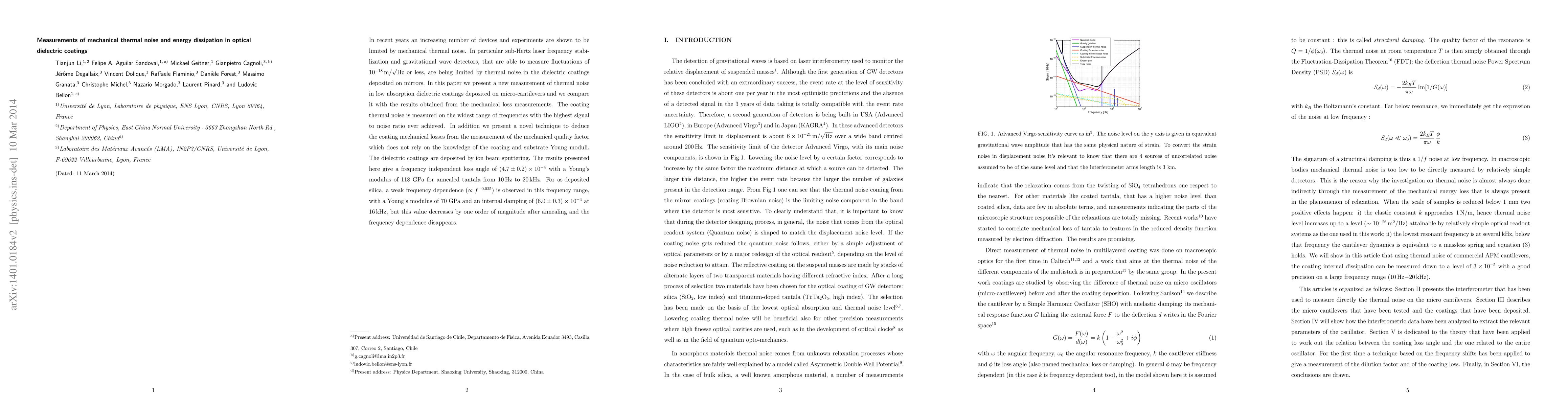 This paper measures mechanical thermal noise and energy dissipation in optical dielectric coatings, finding a frequency-independent loss angle of (4.70 $\pm$ 0.2)x1E-4 for annealed tantala and a reduced internal damping after annealing. It also introduces a novel technique to deduce mechanical losses without needing Young moduli knowledge.